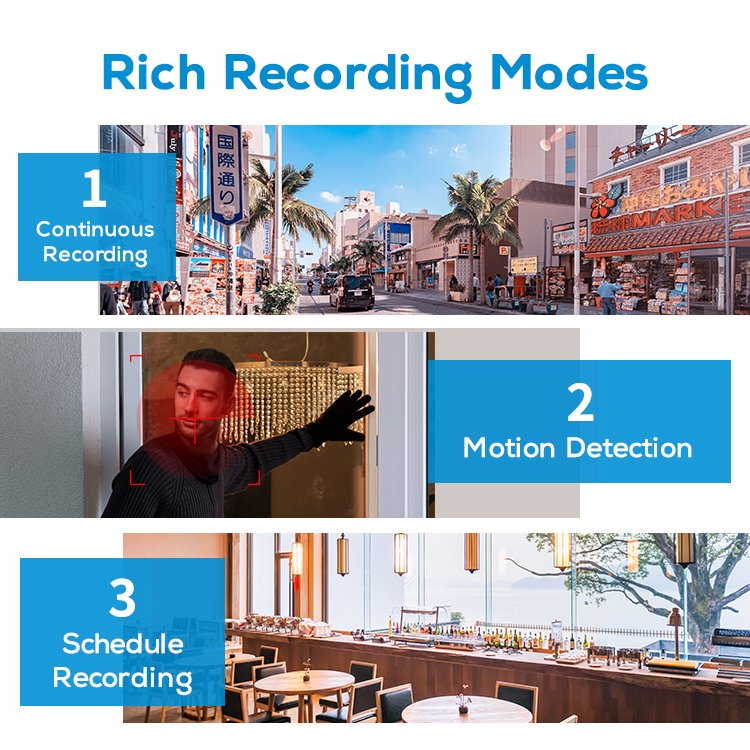 Each Camera comes equipped with 85 & deg; wide-angle advanced glass lens combined with 355 & deg; horizontal & 115 & deg; vertical rotation range create a complete 1080P High-Definition Resolution 360 & deg; Panoramic coverage without blind zone with using the advanced H.264 High Profile compression technology, which can be the lowest code rate and HD image. You can also use it for video recording fast forward, reverse and playback.