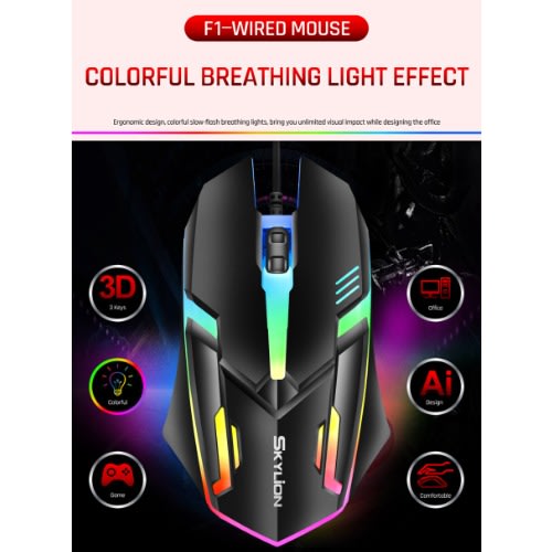 SKYLION F1 Wired 3 Keys Mouse Colorful Lighting Gaming and Office For Microsoft Windows and Apple IOS System