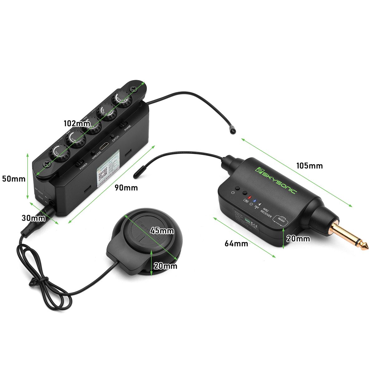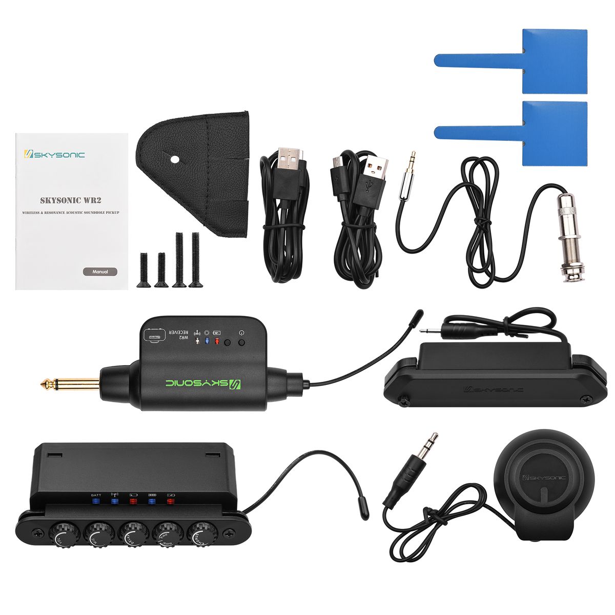 1 x Pickup,1 x Resonance Pickup,1 x Vibrating Horn,1 x Receiver,1 x Output Tail Nail,1 x Tail Nail Leather Case,2 x USB Cable,2 x Line Clamp,4 x Screw,1 x Manual (English)