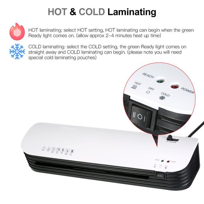 Controlled by a rocker switch, easy to operate, adjust to switch cold laminating or hot laminating mode. The working temperature range is about 115-125℃, the shell temperature is about 30℃.
