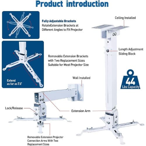 This smaat universal projector ceiling mount is suitable for installation in the office, school church or at home. Easy to set up with its unique low-profile design gives you everything you need for quick adjustment, the flexibility to fit almost any projector and hassle-free projector maintenance