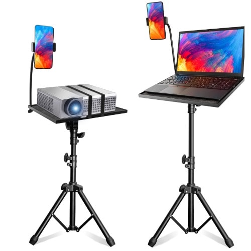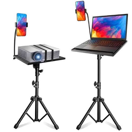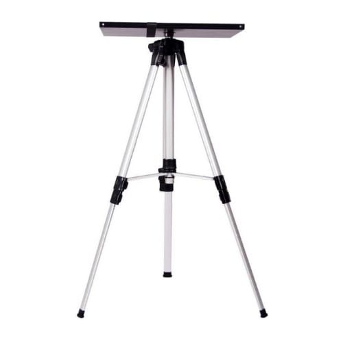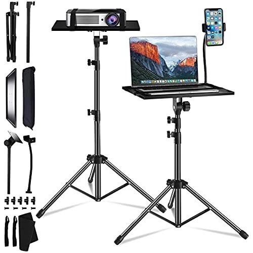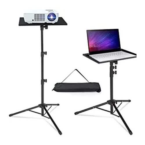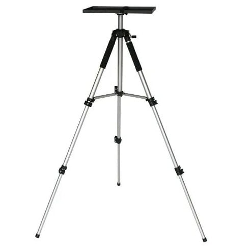 Adjustable Tripod for Projector Heavy- duty tripod bracket can quickly and easily adjust the height from 17.7''to 47.2''.Tray adjustment of 300o.The tray has raised support lips,and sponge gaskets and elastic bands to protect electronic equipment.Clip-type knobs and elastic bands hold the shelf and tray in place.