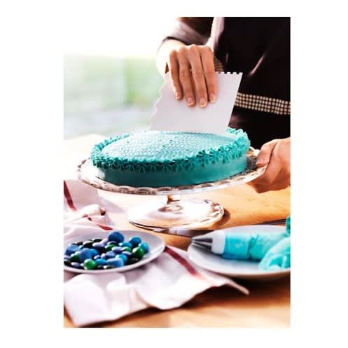 Use your creativity and make your cakes, muffins and other baked goods into works of art with the help of the cake decoration set. The pastry bag has six different piping tubes that create different patterns when you squeeze out for example whipped cream. The decoration comb has three sides with different patterns, so you can easily decorate your cakes with beautiful patterns. Comprises: Decoration comb (13x13 cm), cake divider (length 31 cm, height 11 cm), 1 pastry bag and 6 piping tubes (dia. 2 cm, height 3 cm).
