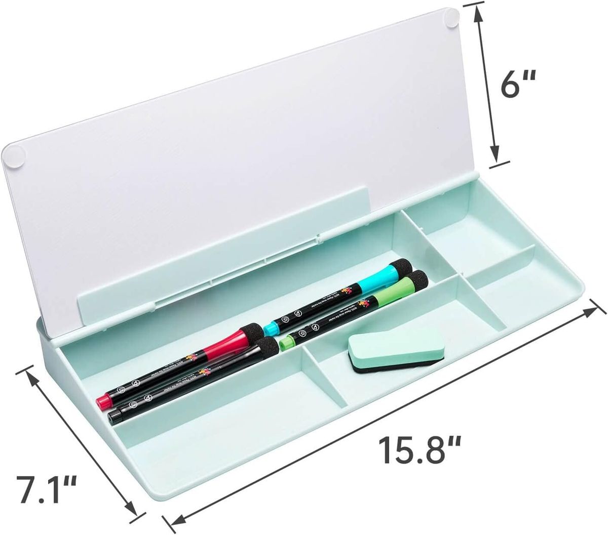 - HIDDEN STORAGE & PAD/MOBILE TRAY: De-clutter your desk by storing markers, magnetic eraser and other desktop accessories in the opening drawer or place markers on the accessory tray for quick access. And one more long tray on the top of the dry erase white board for your pad or mobile.