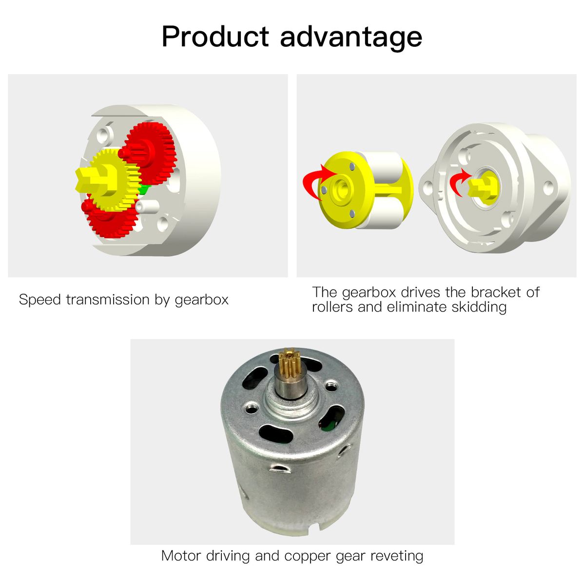 Motor driving and copper gear reveting. Speed transmission by gearbox. The gearbox drives the bracket of rollers and eliminate skidding.