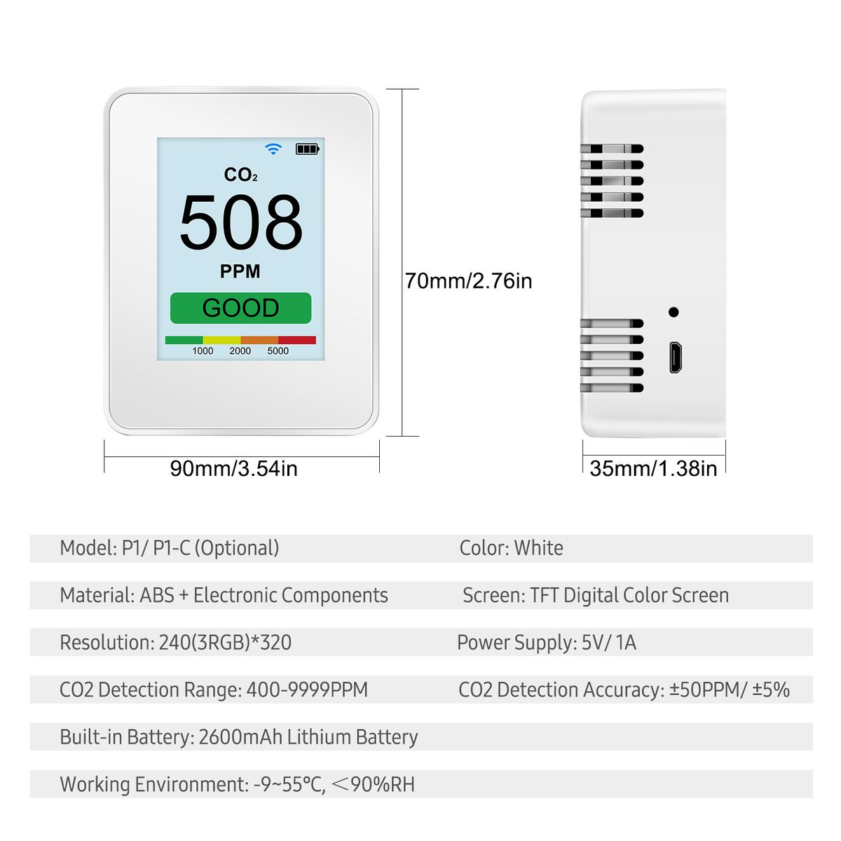 2 Models for Option: P1 is multifunctional and can test the concentration of CO2, PM1.0, PM2.5, PM10, and calculate the number of 0.3μm, 0.5μm, 1.0μm, 2.5μm, 5.0μm, 10μm particles; P1-C can only test CO2 concentration. Both of them can be connected to 2.4GHz wifi, which allows you to remotely monitor anytime anywhere.