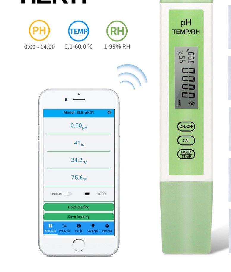 Two calibration methods of: 4.00+6.86+9.18 PH Power or 4.00+7.00+10.01 PH Power4)View data at any time, data can be saved automatically or manually, and data sharing is supported. 5)Range : pH: 0.00~14.00pHTEMP: 0.1-60.0°C; 32.0-140.0℉ RH: 1-99%RH 6)Resolution: pH: 0.01pH TEMP:0.1°C;0.1℉ Humidity:1%RH 7)Accuracy: pH: ±0.05pH TEMP: ±1℃ Humidity: ≤2%RH |