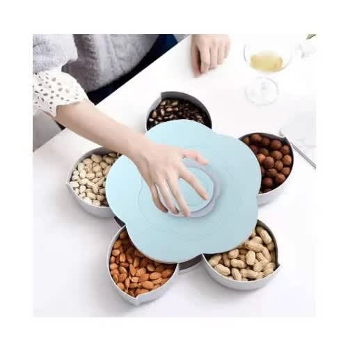Selected high quality food grade plastic material, healthy and safe and practical. The flower rotating candy box is designed to 5 compartments, can storage 5 kinds of snacks, rich in variety and food storage is not mixed.