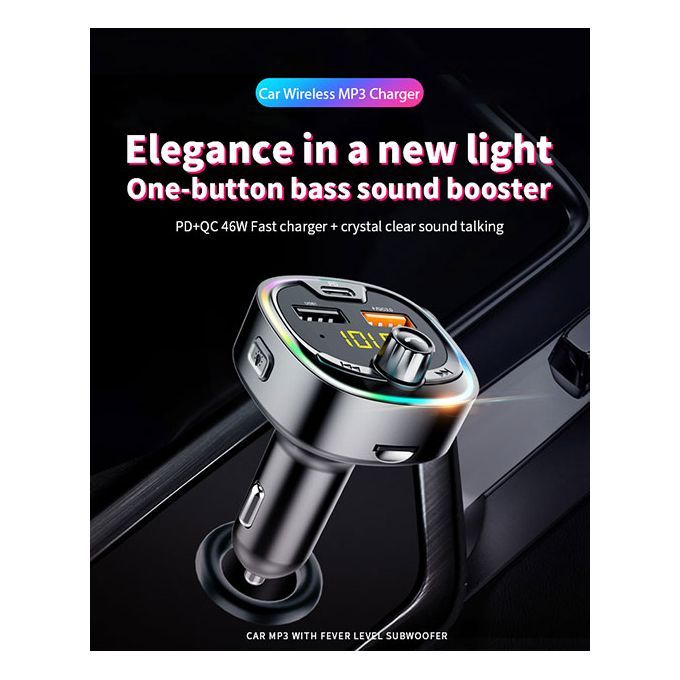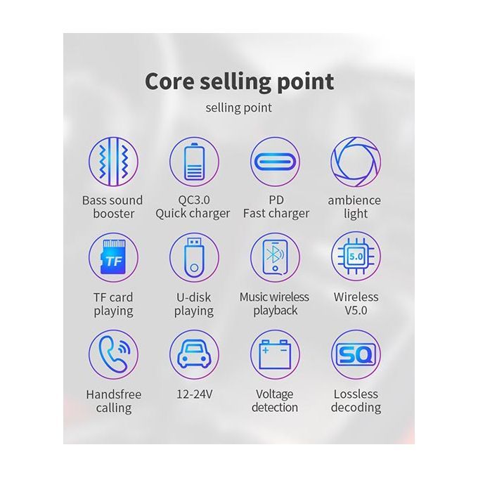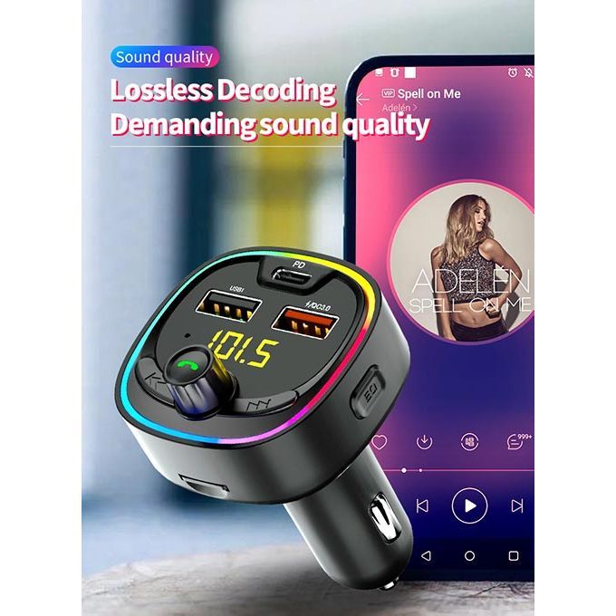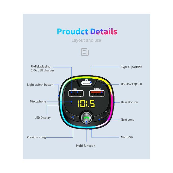 1 Support Bluetooth music playback, wireless transmission of mobile phone music to car audio playback;2. Support U disk/TF card music playback3. Bluetooth hands-free call, caller number dialing, automatically pause music, and hands-free call through car audio after connection; Safer driving4. Multi-port USB car charger, PD18W+QC3.0 fast charging interface +5V/1A USB charging, intelligent output current suitable for all kinds of mobile phones, tablets5. Support hands-free answering, incoming calls short press the phone button to answer long Press reject, double click the last number to call back,6. Transmit at full frequency, 87.5-108.0MHZ 7. LED digital screen, display FM frequency working status (bt, Call, etc.)8. Support mobile phone navigation and amplification, mobile phone charging endurance, while navigating while listening to songs while charging, without interfering with each other 9. Voice broadcast and display of car battery voltage 10. Support car battery voltage detection 11. Support EQ bass function 12. Support music power off memory function 13. Support lossless music playback 14. Support music folder switching 15. Support multi-mode Symphony Ambient Light