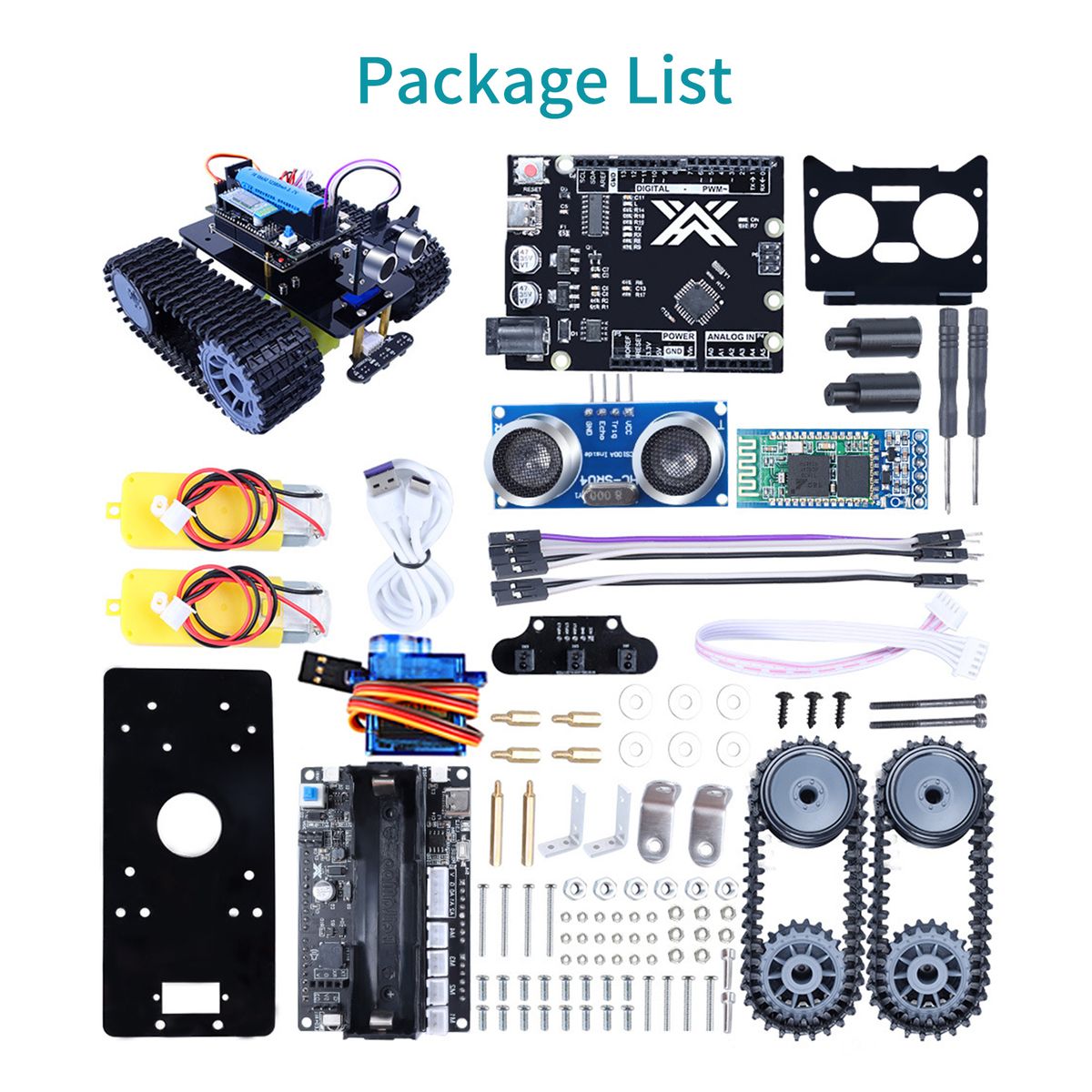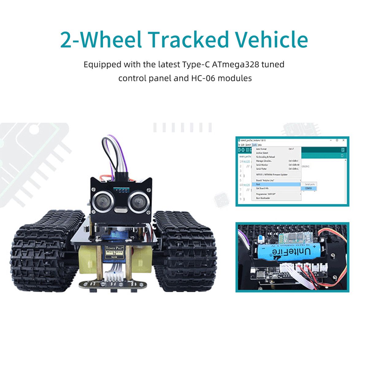 Tank robot is essentially a 2-wheel tracked vehicle, using the latest Type C ATmega328p control panel and HC-06 modules.