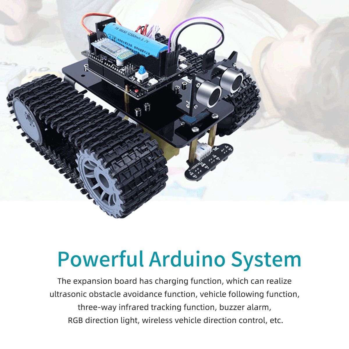 The expansion board has charging function, which can realize ultrasonic obstacle avoidance function, vehicle following function, three-way infrared tracking function, buzzer alarm, RGB direction light, wireless vehicle direction control, etc.