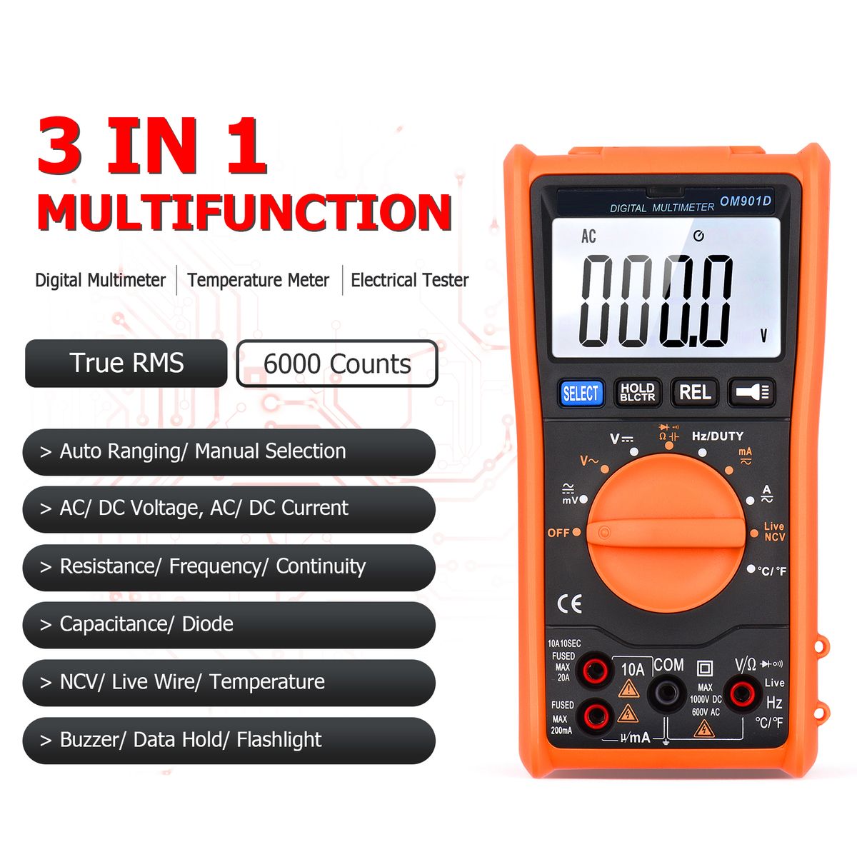 [Auto/ Manual Ranging] High accuracy, wide range, True RMS, 6000 counts, auto recognition or manual selection. It can test AC/ DC voltage, AC/ DC current, resistance, capacitance, frequency, duty cycle, diode, continuity, live wire, temperature.