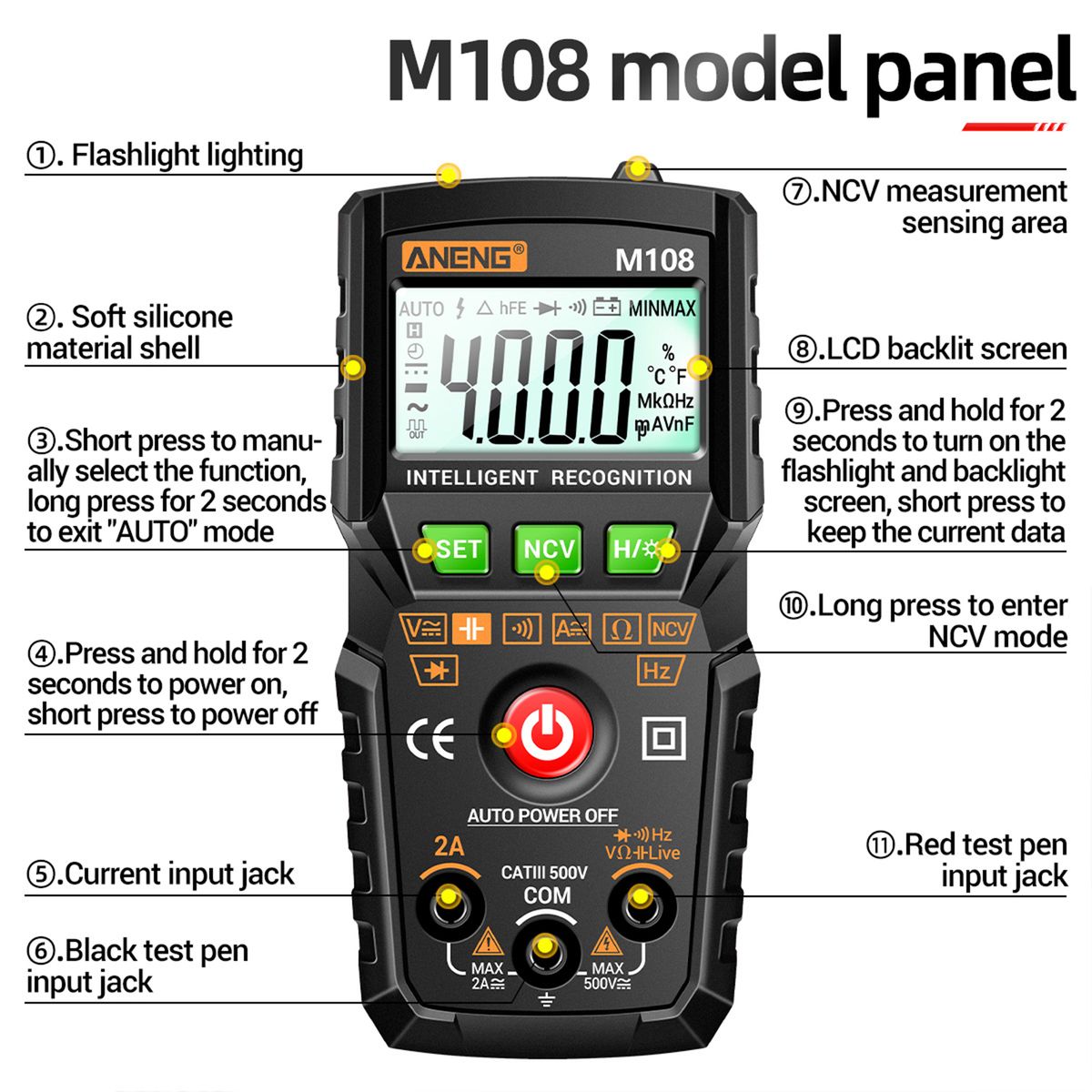 Other Features: NCV non-contact induced voltage, flashlight, automatic shut-down, etc.
