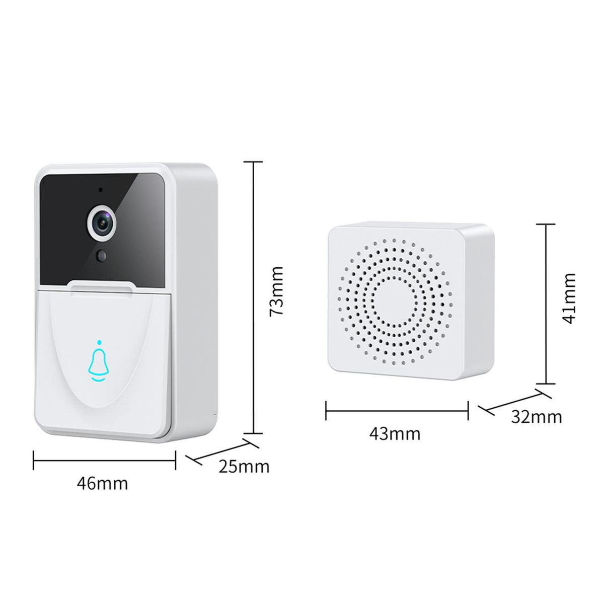 The length of the doorbell is 7.3cm, the width is 4.6cm and the height is 2.5cm. The length of the doorbell chime is 4.3cm, the width is 4.1cm and the height is 3.2cm.