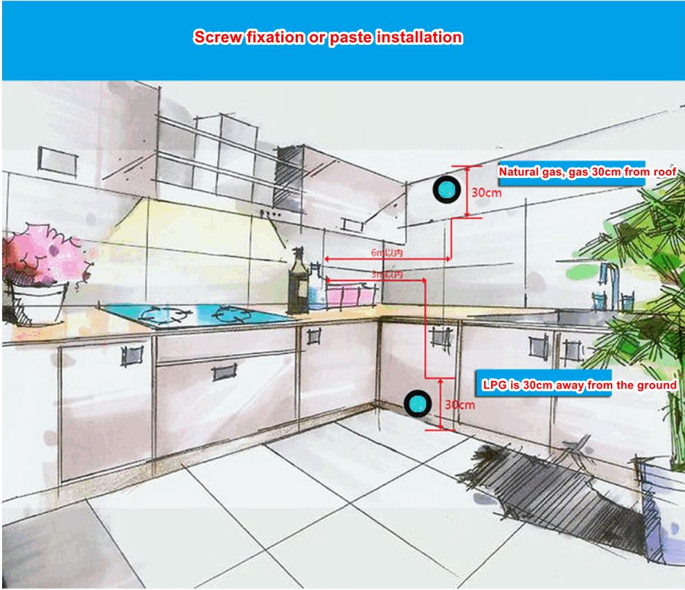 · [Optional Installation Location]- The Gas Leak Detectors installation has two situations. To detect gas heavier than air,please install within a ridial distance of 1.5meters from the gas source at a height of 0.3-1 meter above ground.To detect gas light than air,please install within a ridial distance of 1.5 meters from the gas source,0.3-1 meter under the ceiling.