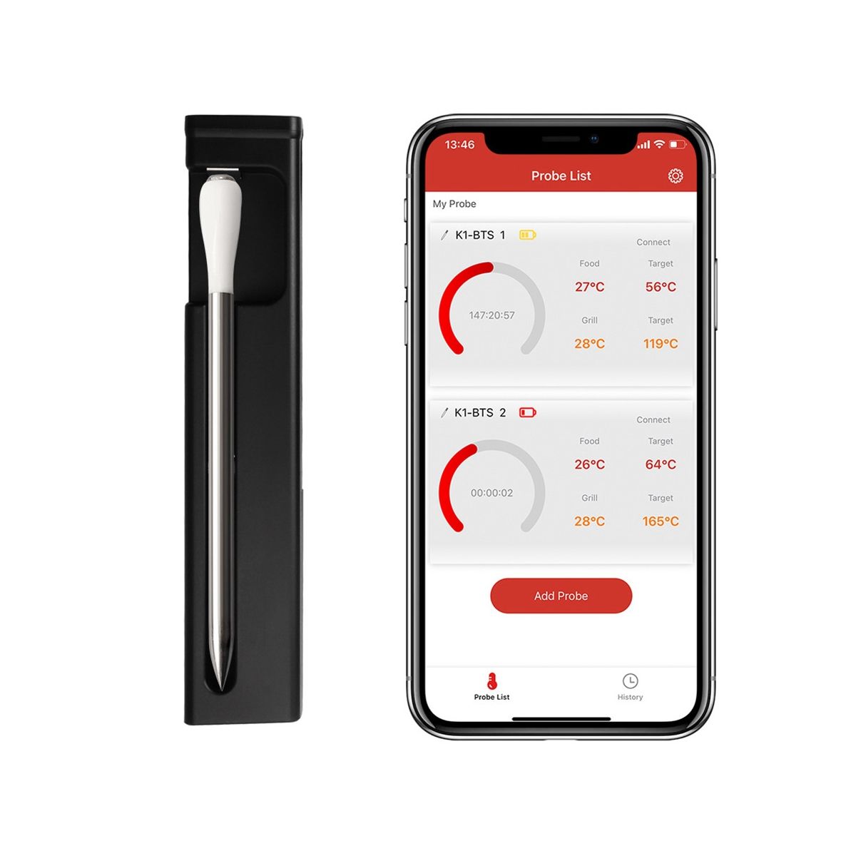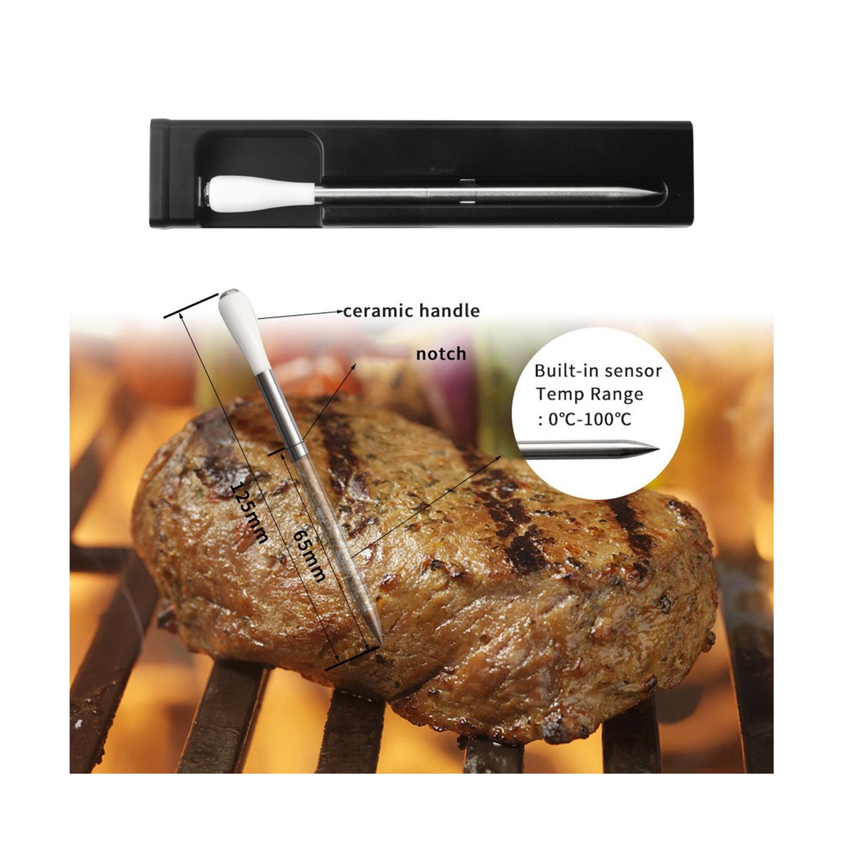 Detailed Information About The Product:Wireless meat thermometer with advanced Bluetooth 5.0 technology, remotely monitor meat temperature on a smartphone app within a 30Meter away range. If loses connectivity with the Bluetooth range, the phone and thermometer will receive an alarm notification.Temperature accuracy: about 1℃(25℃-80℃)