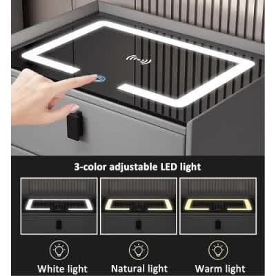 Modern Nightstands: Charge your mobile phone wirelessly by placing it on the top surface, eliminating the hassle of searching for charging cables.Smart Nightstand: Customize your desired ambiance with the intelligent LED light, offering three adjustable colors (white, warm white, warm yellow) for a cozy atmosphere in your room.Smart Bedside Table: Secure your personal belongings with the intelligent fingerprint lock that supports multiple fingerprint recognition, ensuring quick and private access.Bluetooth Speaker Side Table: Enjoy wireless music with the built-in Bluetooth speakers, offering stable and fast transmission while minimizing interference for a delightful listening experience.Multi-purpose Design: This stylish LED bedside table doubles as an end table, suitable for various spaces such as bedrooms, living rooms, and offices, adding functionality to your decor.