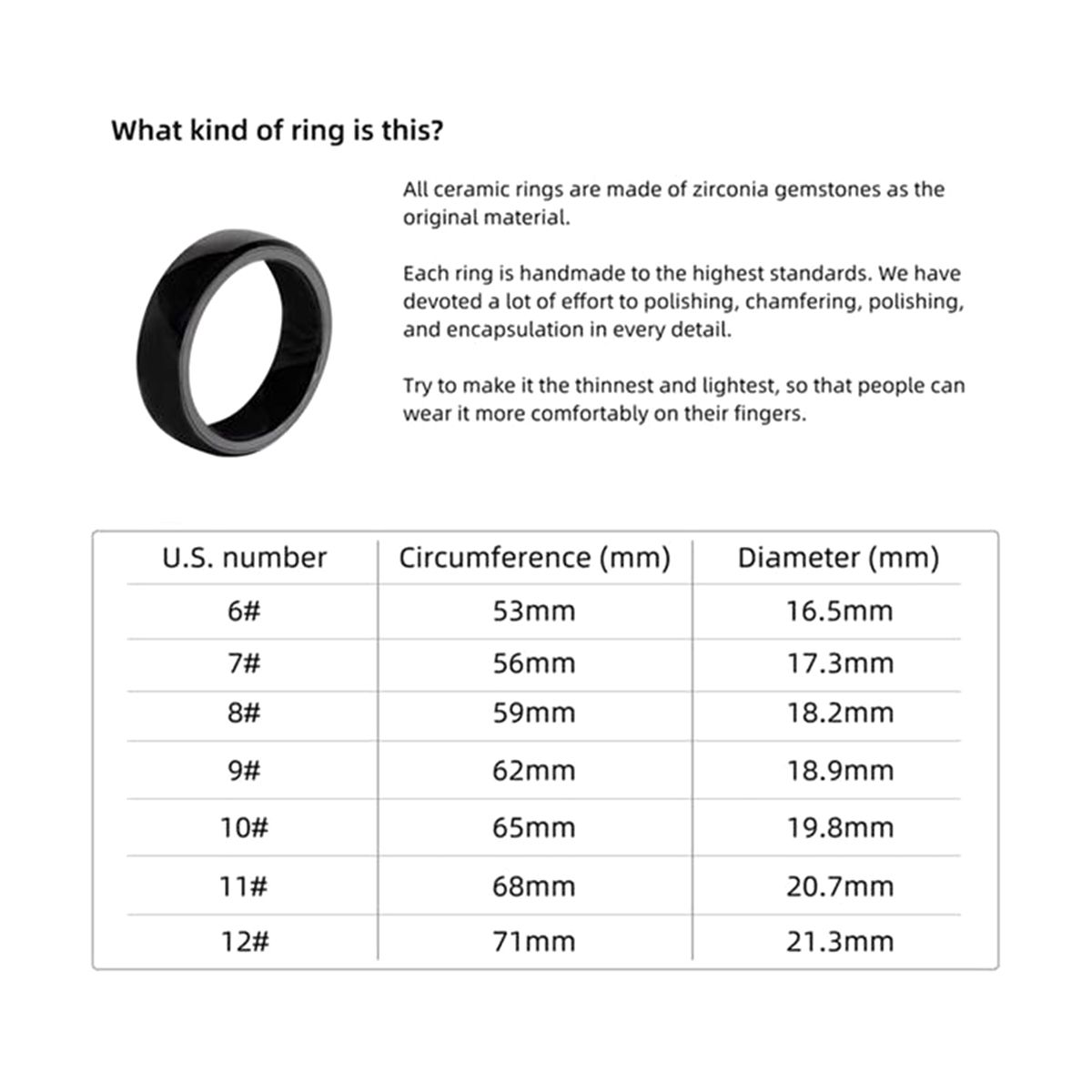 HANDMADE: Made of Zirconia materials. We managed to make the ring thinnest and the lightest which makes it the most comfortable to wear.