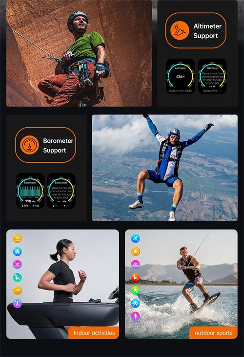 - Support: Heart rate, Breath training, Blood oxygen, Different Sport modes, Ai voice assistant, Pedometer, Sedentary reminder, Sleep monitor, BT music, Dialer, Alarm clock, Calculator, Stopwatch...