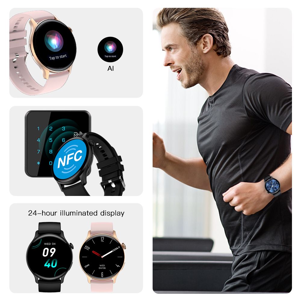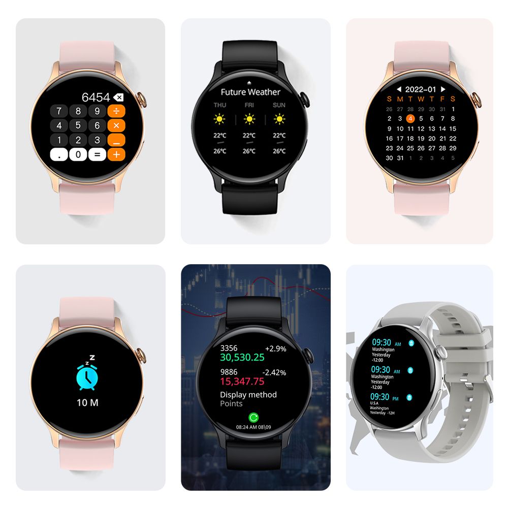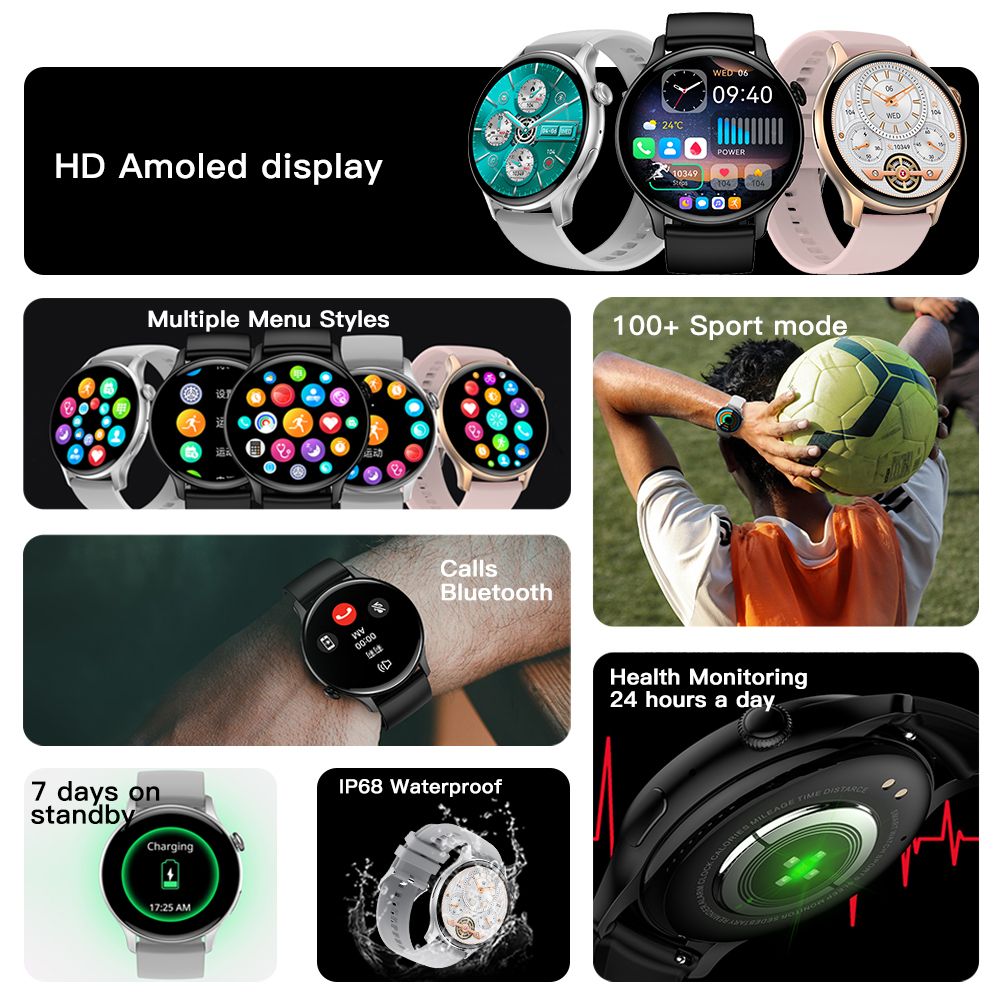 Functional diversity- 466 * 466 Ultra HD Amoled display, Bluetooth Call, report information, voice control, exercise mode, exercise data calories, step counter, IP68 waterproof, health monitoring heart rate, blood pressure, blood oxygen, sleep, female menstrual cycle, games, NFC, weather forecast, calculator, stopwatch, calendar, world watch screen customized search function, control music, photography, Stress, breathing exercises test a sedentary lifestyle and remind you to drink water