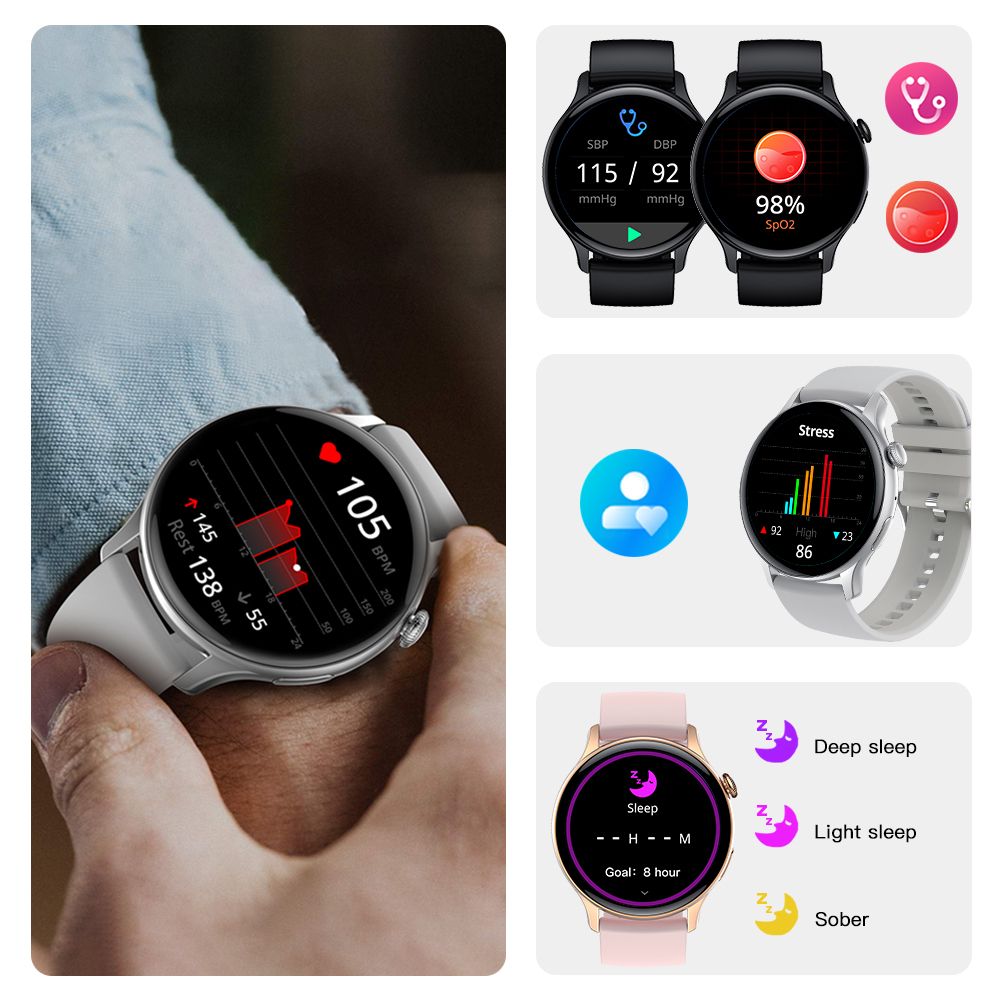 PPG bio-monitoring optical sensors allow you to measure heart rate, blood oxygen, blood pressure and manage a woman's menstrual cycle with just one click to understand your health status.Monitor your heart rate 24/7 and record your heart rate change 24 hours a day. The data can be viewed in the application.Intelligent detection and assessment of heart rate, blood pressure and blood oxygen status. It can be detected at any time, anywhere by the clock.The clock supports 24-hour sleep monitoring, which monitors and records deep and light sleep at night.Through various data analysis, the watch can predict and notify the arrival of a woman's period in advance.