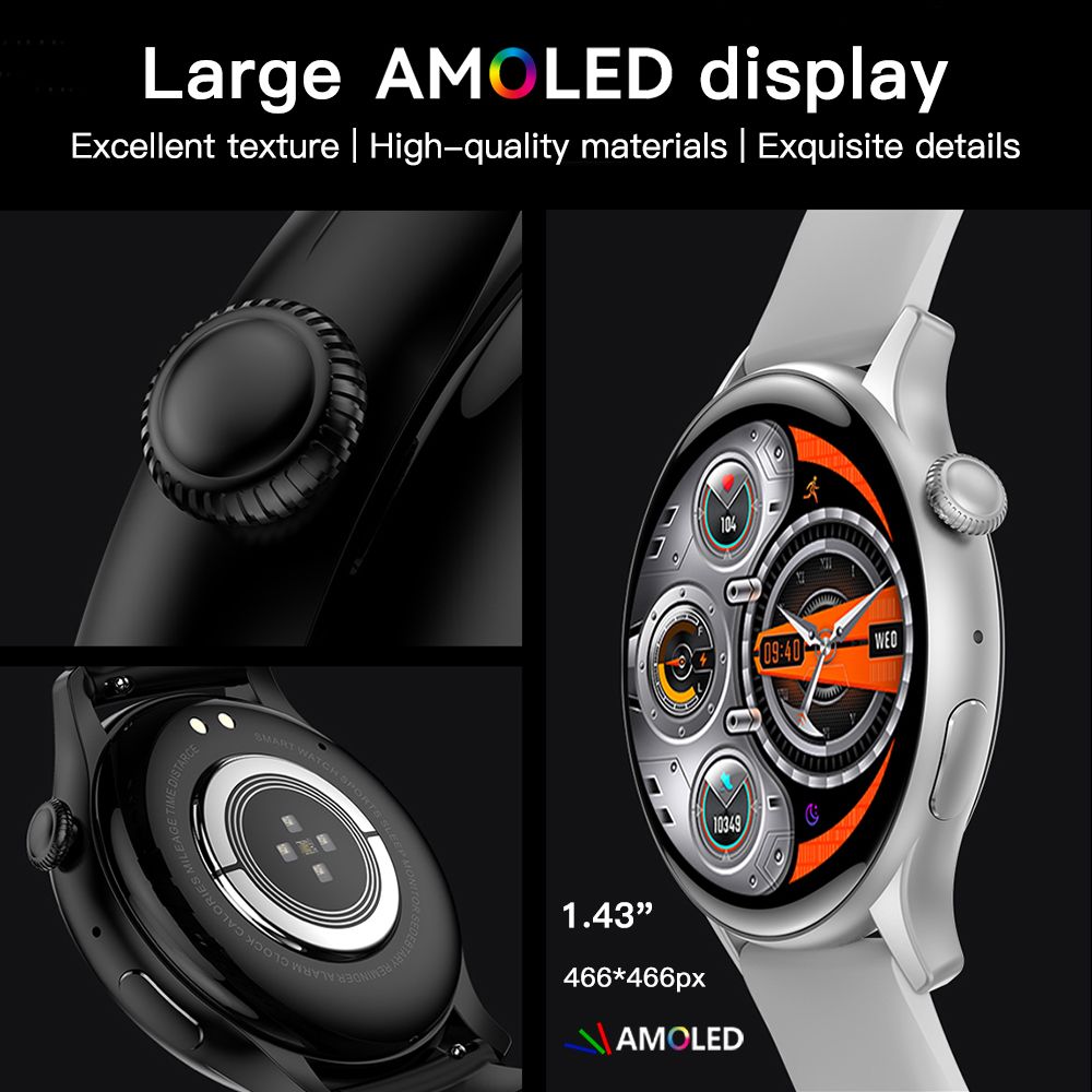 HK85 Smart watch for men and women. 1.43-inch amoled large circular HD display, resolution up to 466 * 466, visual experience is larger and clearer, high sensitivity touch screen, tempered glass such as mirror, titanium alloy integrated body, strong wear, beautiful and generous.