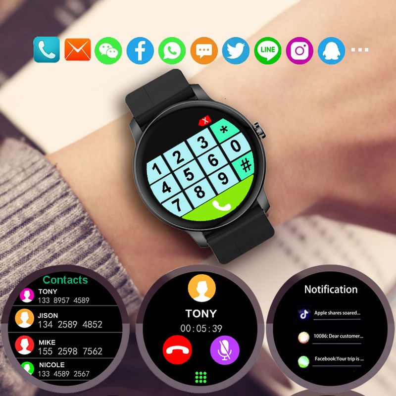 Pictures DescriptionWristwatch categories : Men or womenWristwatch style : Fashion Wristwatch function1. Support Android , IOS 2. Full screen touch 3. Multi language choice4. Multi Sport mode5. Record Steps,calorie,distance 6. Heart rate monitor 7. Sleep monitor 8. Sedentary reminder 9. Message display and dial call10. Control the playing of mobile music11. Control the photography of mobile phone12. Alarm clock13. Stopwatch14. Countdown15. Find phone16. Customize more dial UI17. Brightness adjustment Wristwatch dialWristwatch movement type : SmartWristwatch battery : 230 mAhWristwatch dial shape : RoundWristwatch display type : LEDWristwatch case material : AlloyWristwatch dial window material : GlassWristwatch dial color : Black WatchbandWatchband material : Silicone / stainless steelWatchband clasp type : BuckleWatchband color : Black / pink / blue Size and weightWristwatch length : Approx 26 CMWristwatch dial diameter : Approx 4.2 CMWristwatch dial thickness : Approx 1 CMWatchband width : Approx 2.2 CMWristwatch weight : Approx 50-150 G PackageWristwatch X 1 Waterproof specificationYou can wash hands and face with wearing it.But it doesnt support bathing, swimming, diving.How to make a callImportant note: make a call or play music, you must complete two Blue-tooth pairing, one is app pairing and the other is mobile phone pairing.After the first manual connection is successful, as long as the Blue-tooth is turned on in the future, the smart watch will automatically connect to the mobile phone.app pairing1. Search for M2Wear in Google Store or Apple Store, and then download the M2Wear APP.2. Turn on the Blue-tooth function of the smart watch and also turn on the Blue-tooth function of the mobile phone.3. Open the M2Wear APP on the phone, search for the smart watch and connect it. The device name of the smart watch is Z2 .mobile phone pairing4.Open the Blue-tooth list of the mobile phone, search for available devices, find the Z2 device, and click it to pair.5.Make a call or play music on the smart watch.Smart Watch Women Full Touch Screen Fitness Tracker IP67 Waterproof Bluetooth Call Round Smartwatch Men For Android IOS MI PhoneSmart Watch Women Full Touch Screen Fitness Tracker IP67 Waterproof Bluetooth Call Round Smartwatch Men For Android IOS MI Phone