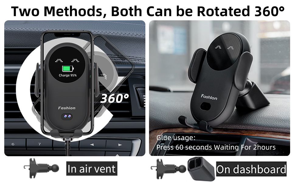 1 x Car Wireless Charger 1 x USB Cable 1 x Air Vent Clip1 x suction cup phone mount for Car1 x Tightening Nut
