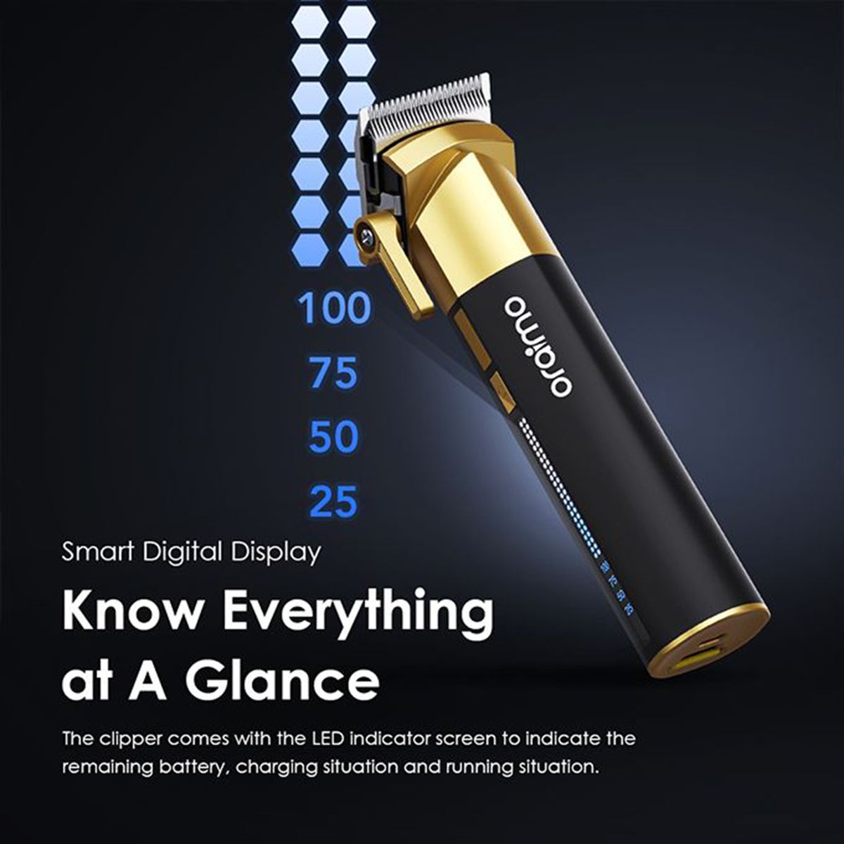 The clipper comes with the LED indicator screen to indicate the remaining battery, charging situation and running situation.
