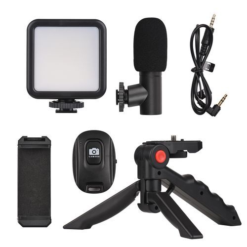 A nice Vlog kit with mini LED video light, condenser microphone, extendable phone clip, mini tripod, and remote control, the brightness of video light is adjustable, perfect for live streaming, Vlog recording, selfie, and more. Come and buy it now, it will surely bring you great using experience!