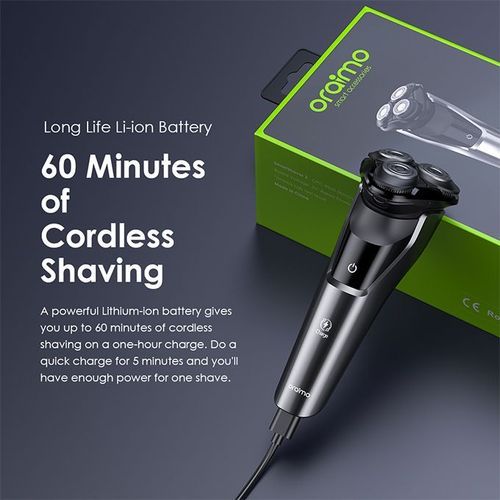 A powerful Lithium-ion battery gives you up to 60 minutes of cordless shaving on a one-hour charge. Do a quick charge for 5 minutes and you'll have enough power for one shave.
