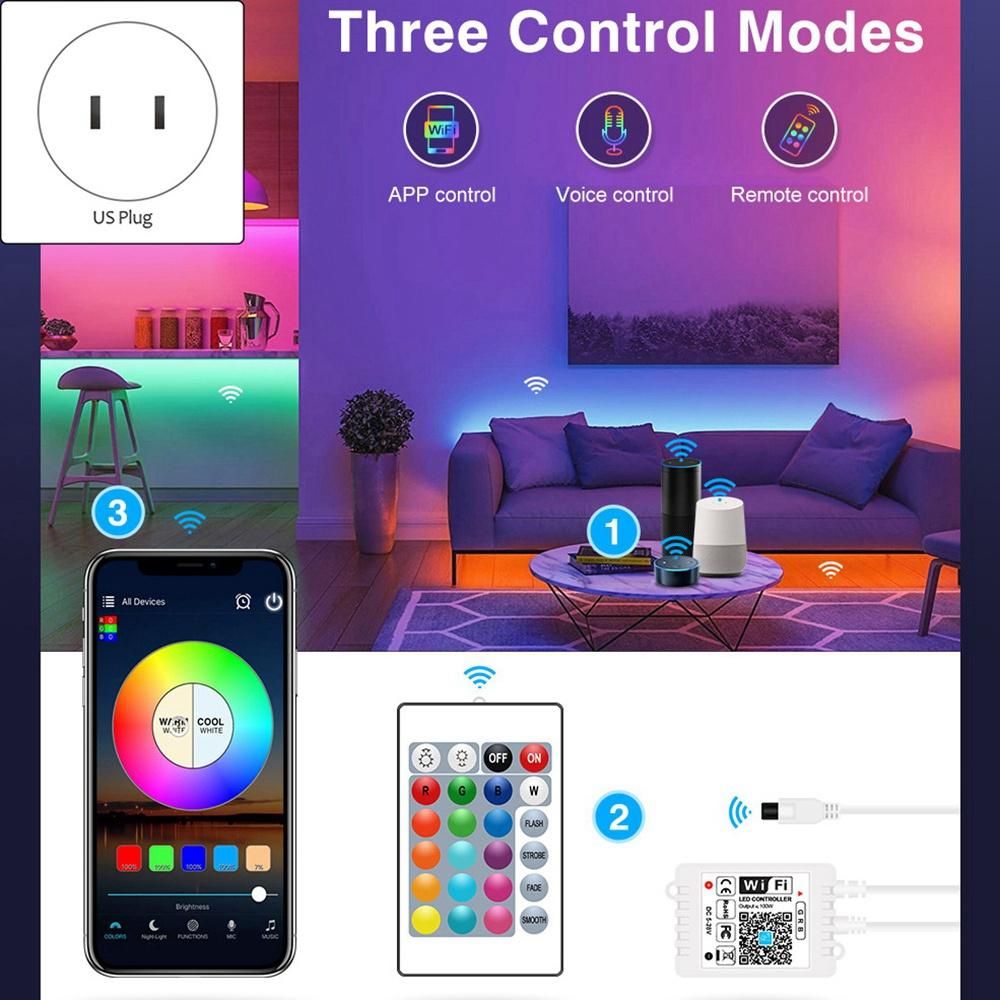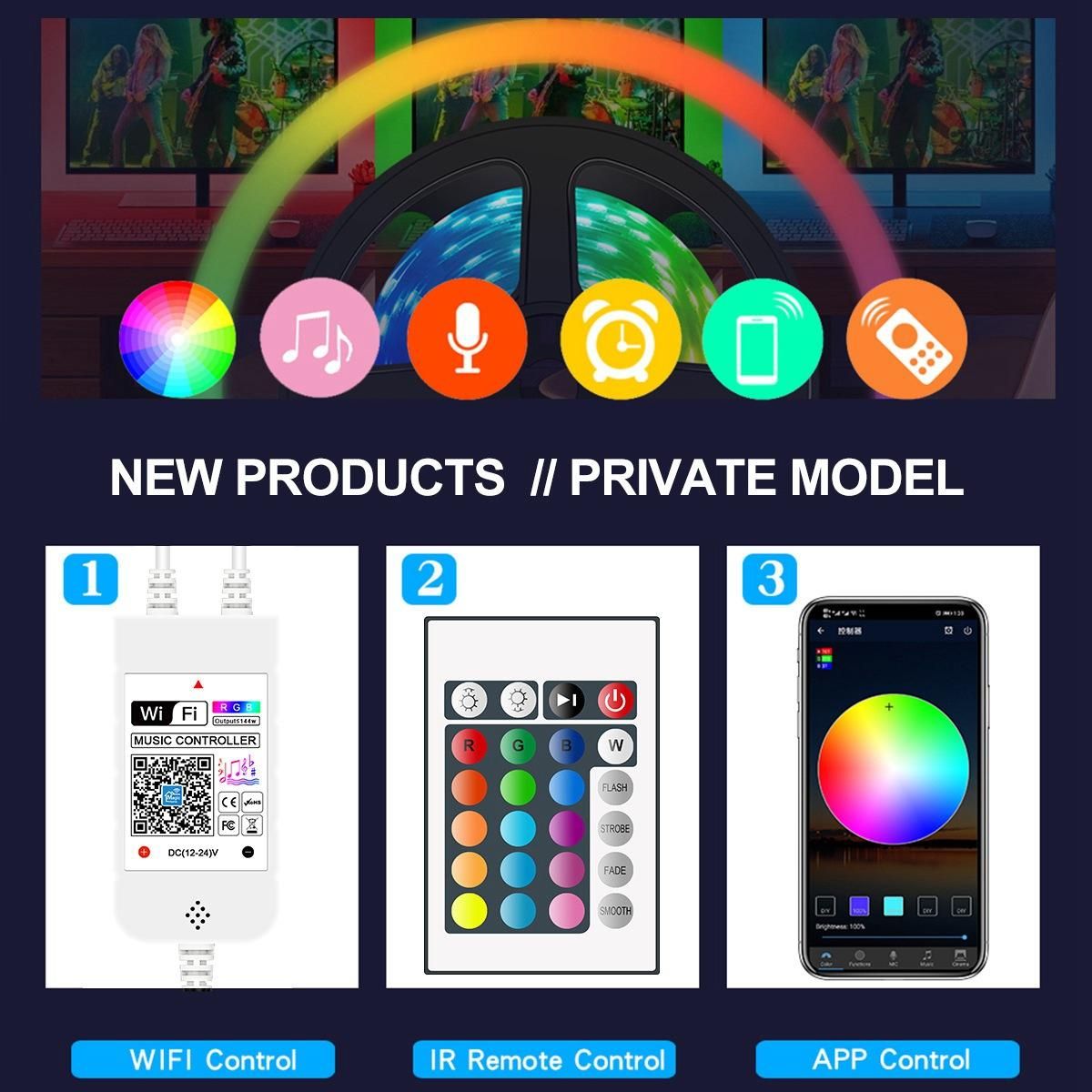[Remote & APP/Bluetooth Control]: Infrared 24-key control, providing 16 static colors, dynamic modes (flash/strobe/fade/smooth), brightness and dynamic mode speed adjustable; millions of colors, dynamic modes, Group control, DIY color, dimmable light and color temperature adjustment, music control, microphone mode, timing, etc. are controlled via APP/Bluetooth.