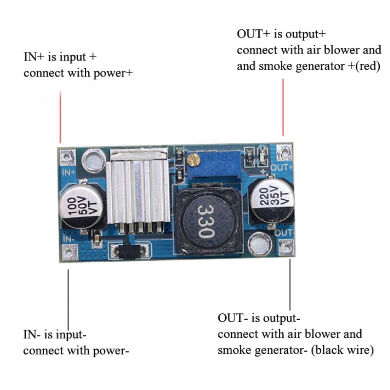 6、For 5.3,6.0 ,and 6.1S(without 160A letters on the shell) main board,it must be used with the voltage reduce plate, connect the heat wire to the voltage reduce plate(default output is 6V).Connect heating wire and blower motor in parallel to the voltage reduce plate OUT +-. Connect the IN+- with mainboard port for smoke generator