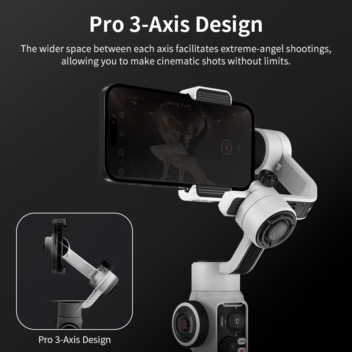 【Pro 3-Axis Design】SMOOTH 5S stands out with its professional structure of 3 orthogonal pivot axes that bring you more possibilities with greater vision. The wider space between each axis facilitates extreme-angel recording, allowing you to record cinematic videos without limits.