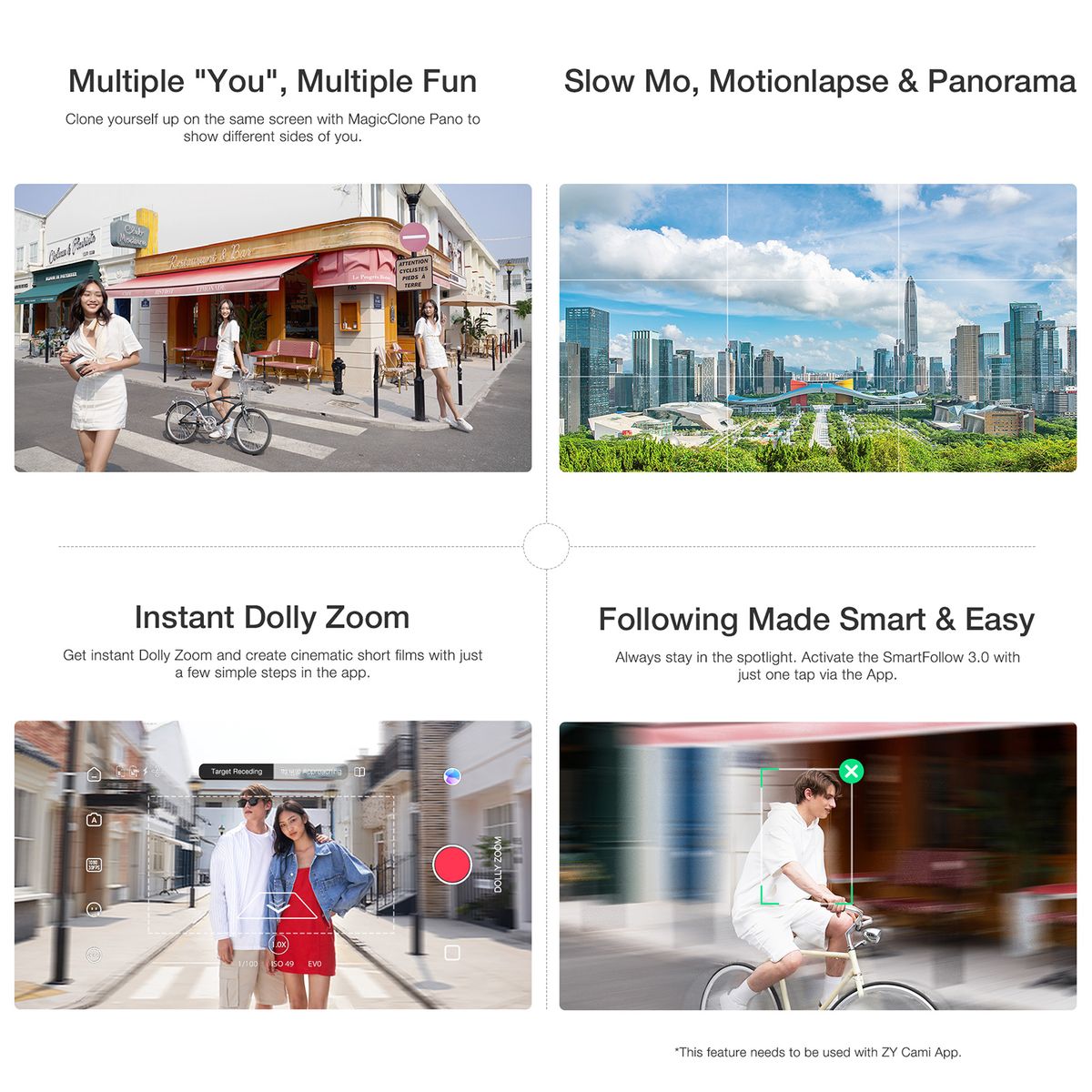 【Smart Follow & Say Yeah to Gesture Control】Activate the SmartFollow 3.0 with just one tap via ZY Cami APP, and always stay in the spotlight; and you can use just a single gesture to control the shooting while you can just be yourself anywhere anytime. Available in multiple panorama modes.