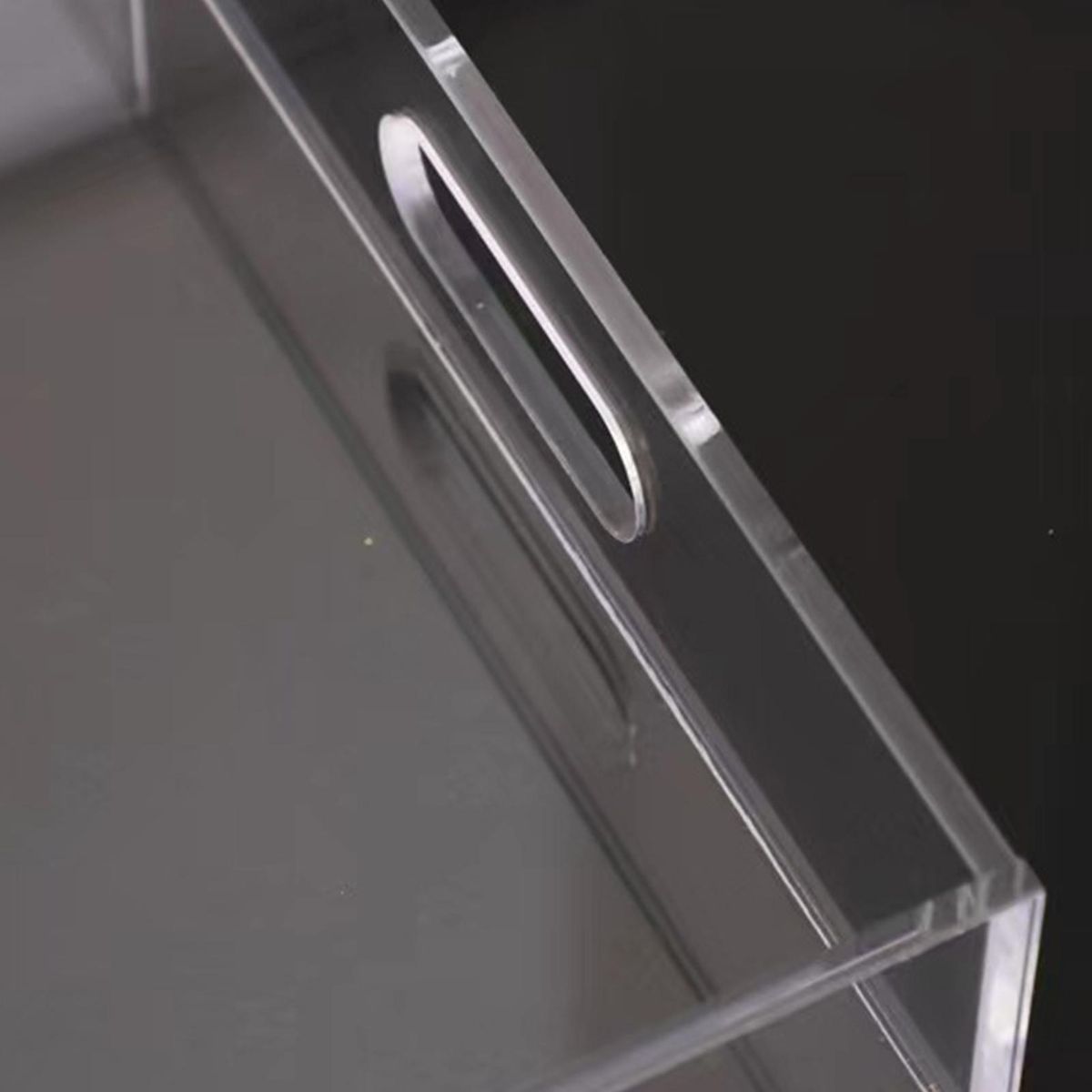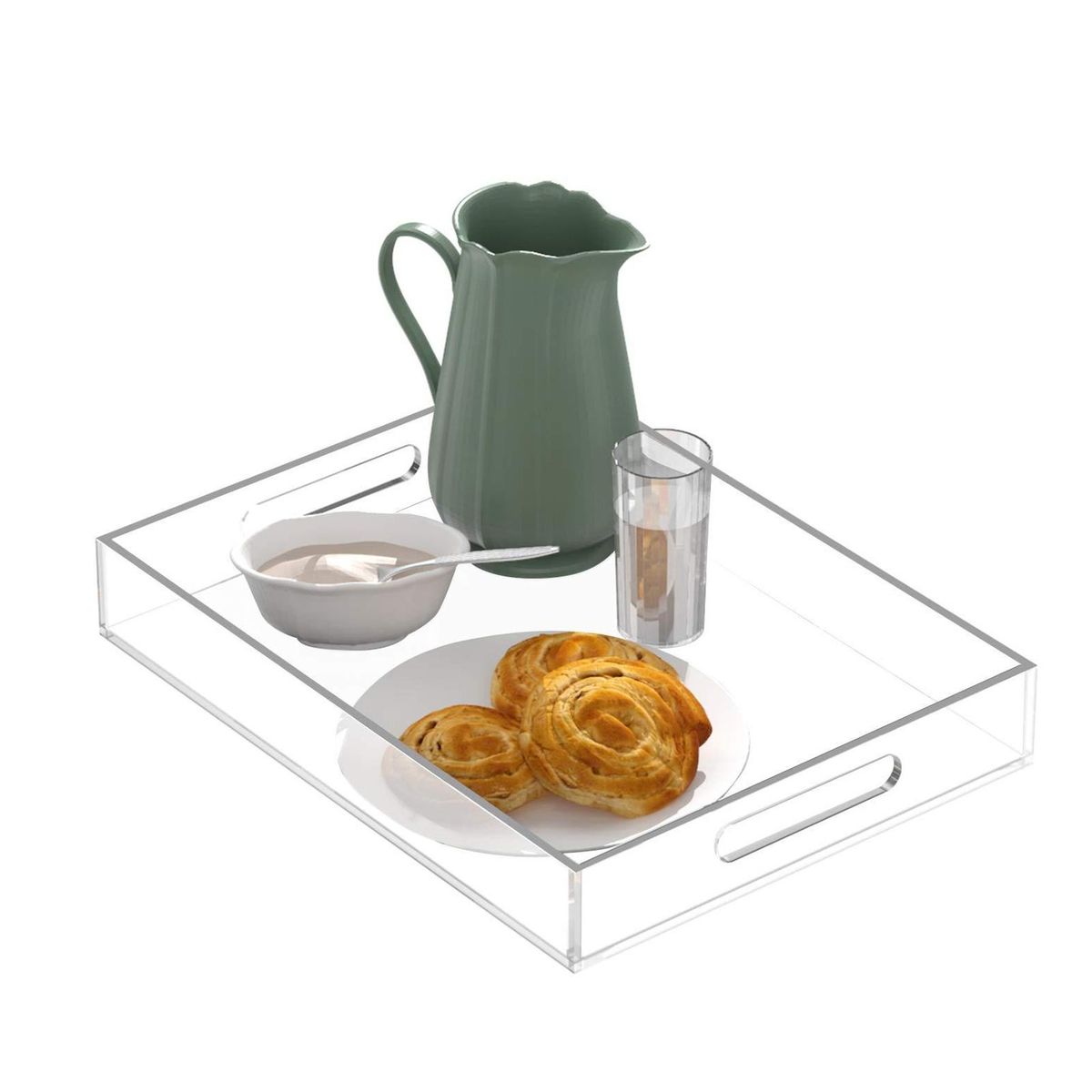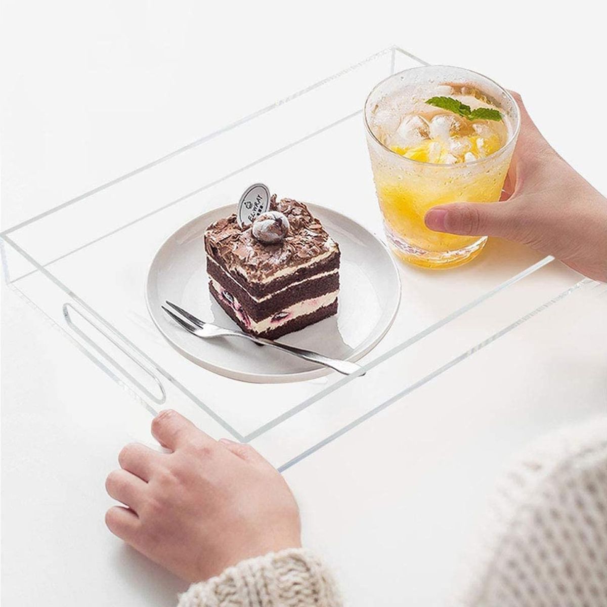 Our versatile acrylic serving tray with convenient handles on the side, designed to enhance your serving experience. this multipurpose tray is perfect for serving breakfast, appetizers, coffee, drinks, desserts, and even food in bed for kids or guests. crafted from high-quality acrylic material, this clear tray not only ensures durability but also adds a touch of elegance to any setting. its transparent design takes up minimal visual space, allowing you to effortlessly organize remote controls and magazines on your coffee table or display toiletries on your dresser. .