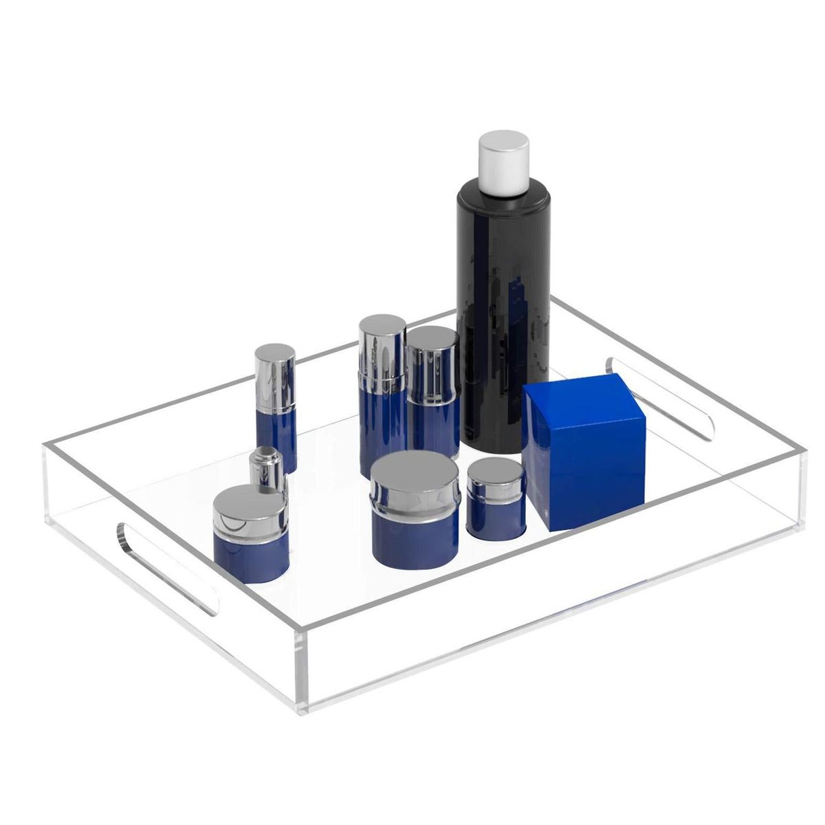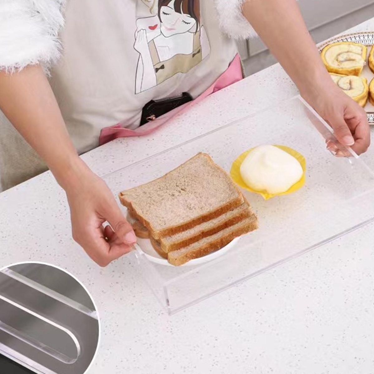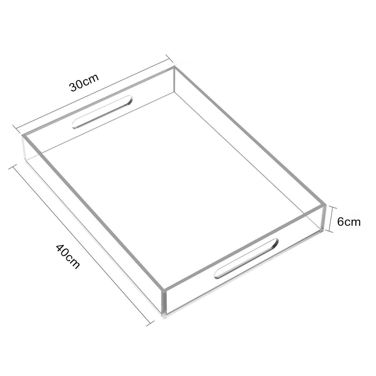 Our versatile acrylic serving tray with convenient handles on the side, designed to enhance your serving experience. this multipurpose tray is perfect for serving breakfast, appetizers, coffee, drinks, desserts, and even food in bed for kids or guests. crafted from high-quality acrylic material, this clear tray not only ensures durability but also adds a touch of elegance to any setting. its transparent design takes up minimal visual space, allowing you to effortlessly organize remote controls and magazines on your coffee table or display toiletries on your dresser. .