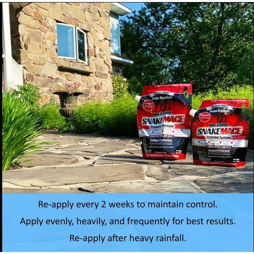 Re-apply every 2 weeks to maintain control. In areas where snake visits are heavier and more intense, additional and/or more liberal applications may be required. This will eventually teach snakes to avoid and stay clear of treated areas. Re-apply after extensive rainfall.