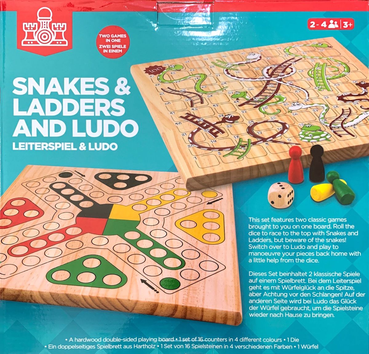 This set features two classic games brought to you on one board. Roll the dice to race to the top with snakes and ladders, but beware of the snakes! switch over to Ludo and play to manoeuvre your pieces back home with a little help from the dice.