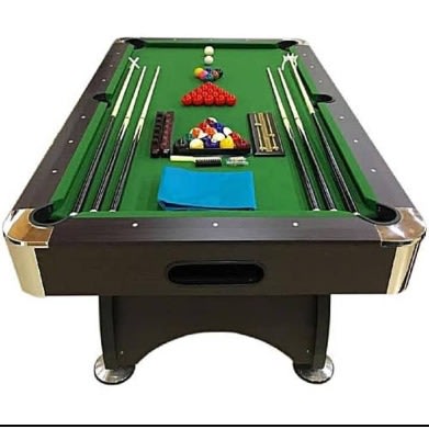 Your Brand new standard 7ft Snooker table/pool board. It is well designed and comes with accessories, such as cue sticks, 2balls (numbered and plain), 1chalk , triangle, brush, Rest, Including Top cover. It comes with a green felt and black body.
