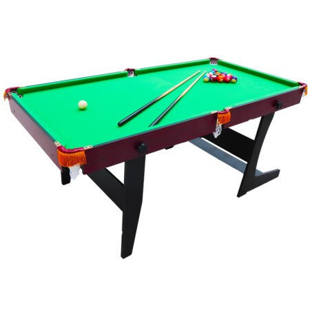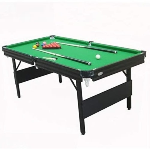 Foldable 6 feet snooker pool table. Imported and with the accessories, including Cue sticks, Balls, Chalk, etc. This pool table is a great space saver; it can easily be folded up after use. Measurement: 6 feet by 3 feet. Comes with a green colour felt.