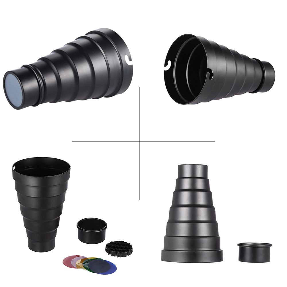 This snoot is made of high quality aluminum alloy, more durable and lightweight. It helps you to focus the light and pinpoint the product details. The five color filters(Transparent, red, green, blue and yellow) creat effects at different color temperatures. Ideal for studio