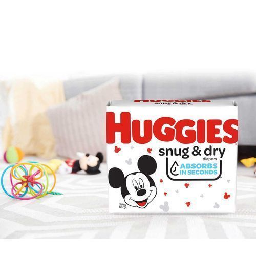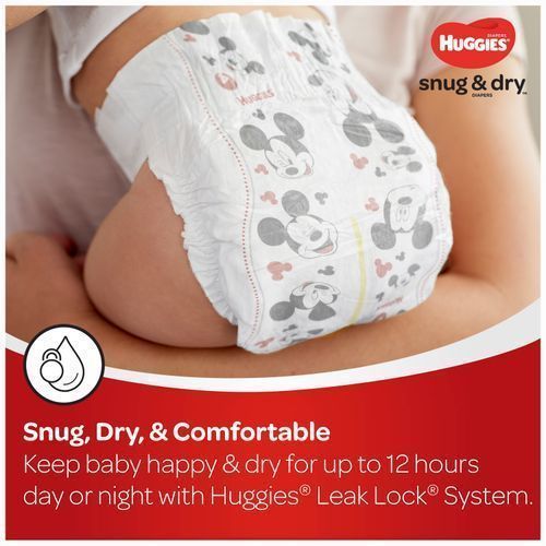 Huggies Snug & Dry Diapers provide great protection at a great value, up to 12 hours day or night. Featuring our Leak Lock System & Quilted Liner, Snug & Dry baby diapers are made with four layers of protection that absorbs wetness in seconds & helps pull the mess away from baby's sensitive skin. Plus a wetness indicator changes color to let you know when it's time for a diaper change. Huggies disposable diapers are hypoallergenic, fragrance free, paraben free, latex free and free of elemental chlorine bleaching. Featuring fun Disney Mickey Mouse designs, Snug & Dry Diapers are available in sizes Newborn (up to 10 lb.), 1 (8-14 lb.), 2 (12-18 lb.), 3 (16-28 lb.), 4 (22-37 lb.), 5 (27+ lb.) and 6 (35+ lb.). Join Huggies