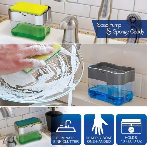 We are going to get a whole lot faster with this Soap Pump & Sponge Holder for you. Fill it up with 13oz of your favorite dish soap lotion, then use any sponge, rag or dish scrubber to press down on the pump, which dispenses the perfect amount of dish soap up. When you need more, just pump again for another shot of soap. Easy to use!