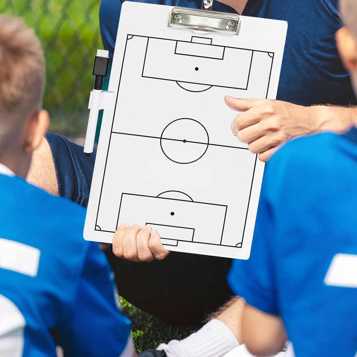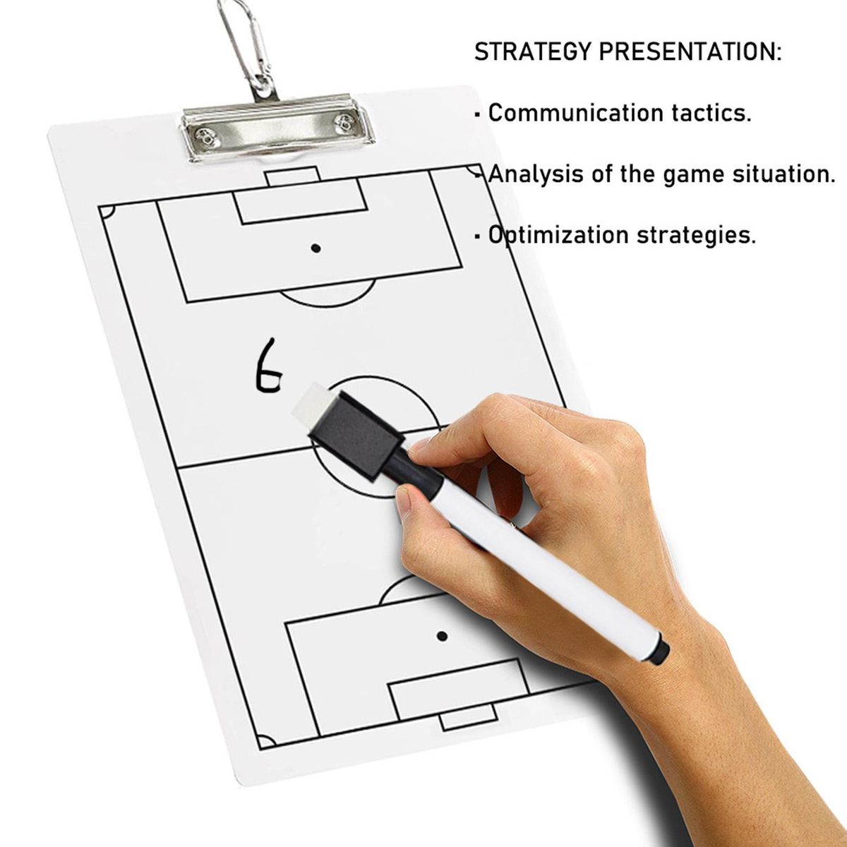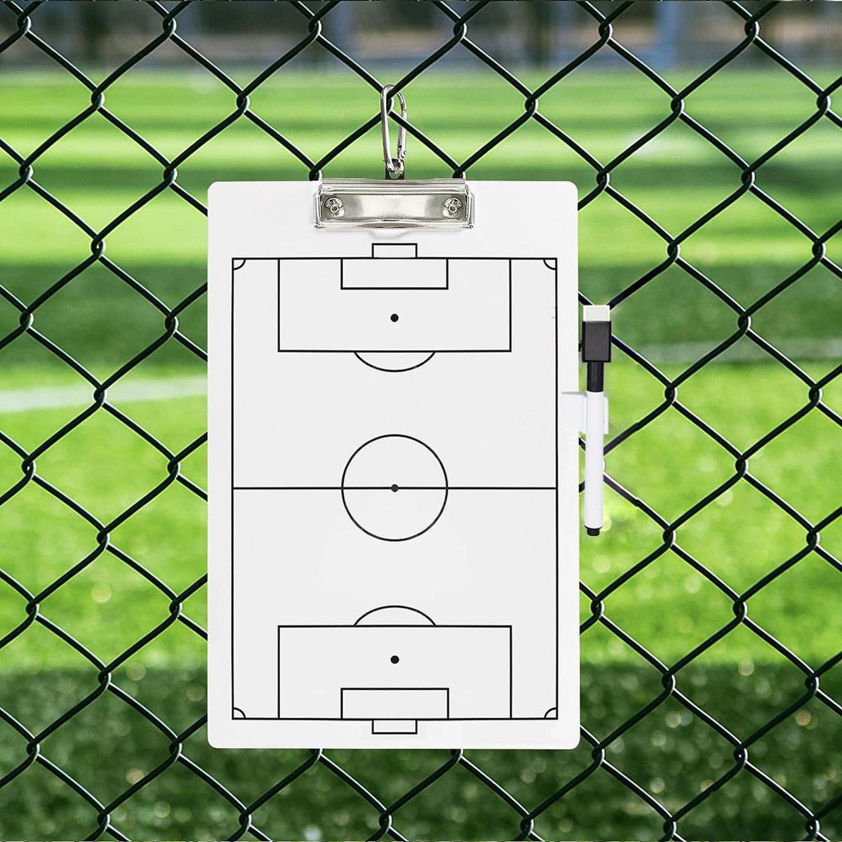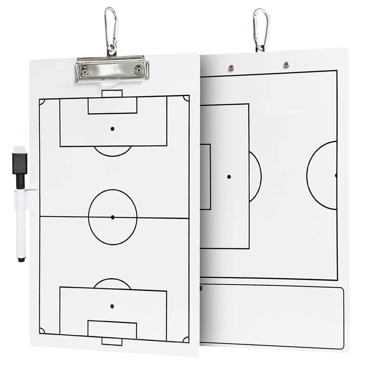 The double-sided design provides coaches with a comprehensive view of the entire game board, ensuring a clear understanding of the strategies at play. each set includes a tactical board, pen holder, erasable pen, and hook for convenient storage. .