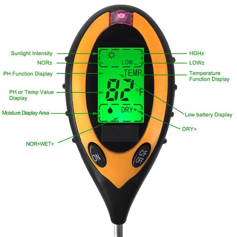 - Measures sunlight (9 levels),soil moisture (5 levels),soil pH (12 levels)and temperature (°C & °F)