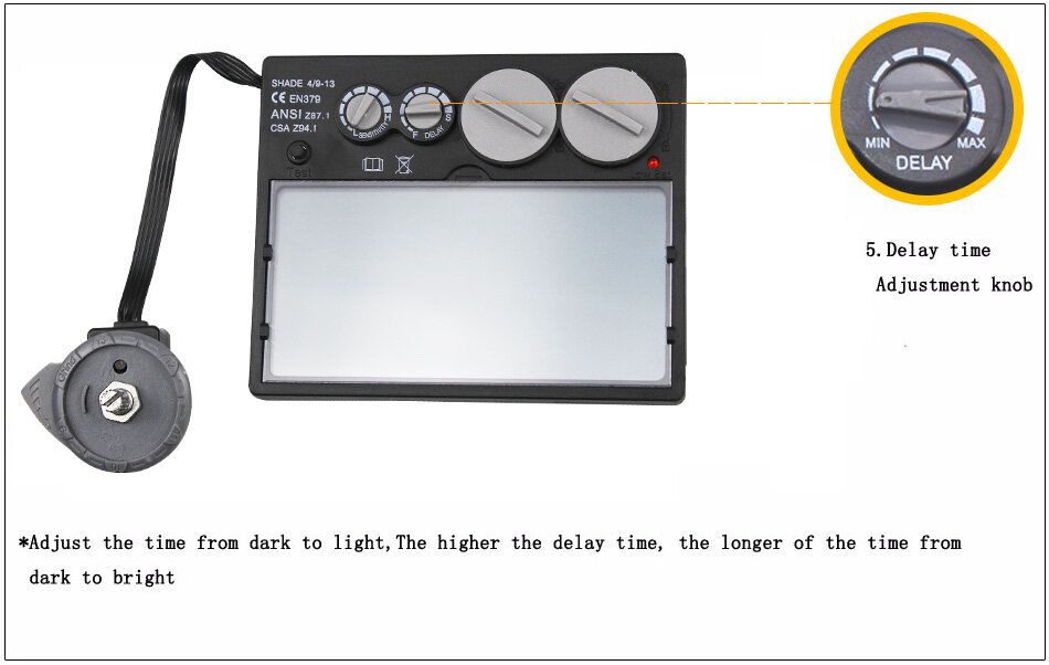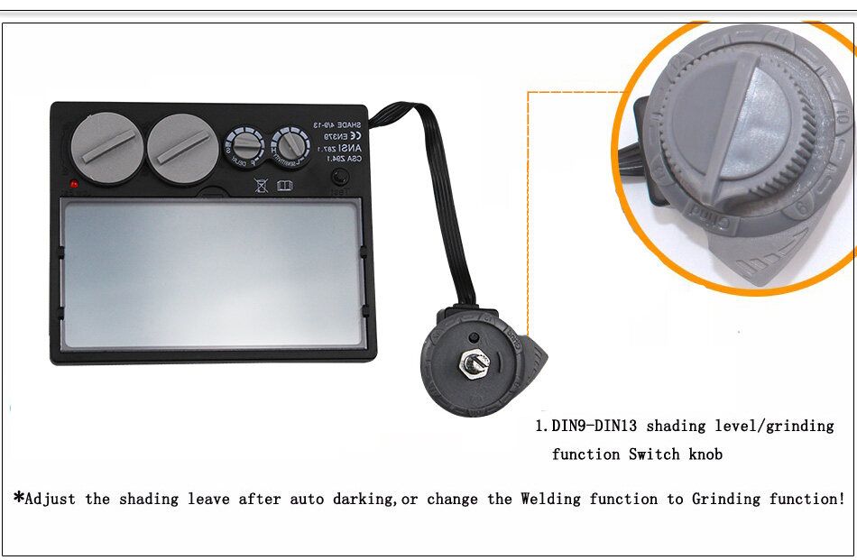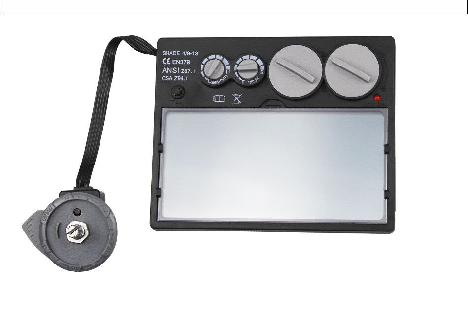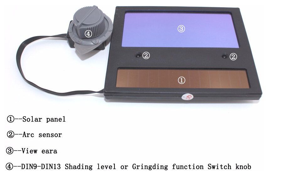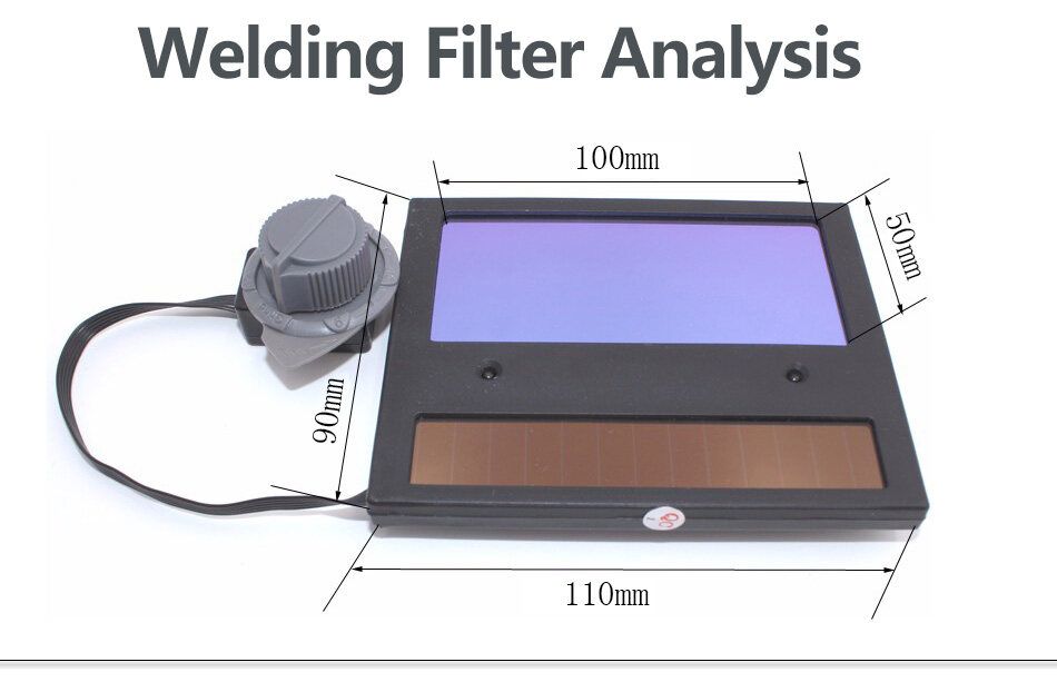 FilterSize110mm*90mm*9mmActiveViewingArea100MM*50MMLightShadeDIN4DarkShadeDIN9~13WaytoshiftDarkStateOuterControl,steplessshiftSwitchingTime1/10000SSensitivityAdjustmentSteplessControlDelayTime0.1S~0.6SPowerSupplylithiumbattery/SolarpoweredRatedCapacityofLithiumBarrtery600mAh/1200mAhOperatingTemperature-10 centigrade~65 centigradeSensorstoWeldArc2MaskMaterialPA/PPProtectGradeagainstUVBDIN15InsideProtectshelter102.8mm*52.5mm*1mmOutsideProtectShelter109mm*89mm*1mmGrinding functionyeslow warnyespower functionyes