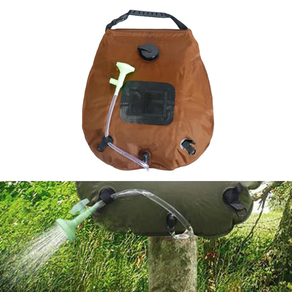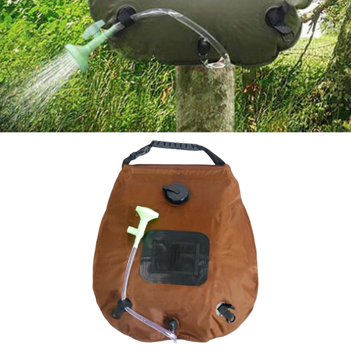 Outdoor Solar Shower Bag: Solar outdoor Shower Bag, Made by environmental friendly,leak proof and strong PVC material, not easy to break.Efficiently absorb the solar energy to heat up the water inside the bag. Before first use, wash the bath bag with a small spoon of soda water and warm water.Large Water Capacity: 5 Gallon/20 Liters, enough water for multiple showers. After being filled, it can last showering for about 10 minutes. It heats water to about 113°F (45°C) in 3 hours with direct sunlight. Let you enjoy a better and refreshing shower anywhere.Temperature Indicator: There is a temperature indicator (33-53°C/°F) attached onto the bag, convenient for monitor the temperature of water, clear at glance. We offer a storage bag for portable carry out.Multi Features: There is a front mesh pocket to keep , and other shower accessories; Comfortable Silicone handle, strong bearing capacity; Supplied with a 50cm shower nozzle with hose, rotation type, easy to whirl.Camping Accessories: Suit for outdoor camping, hiking, backpacking, self driving, or hunting.It's the best gift for for Men Husband and Father's Day.