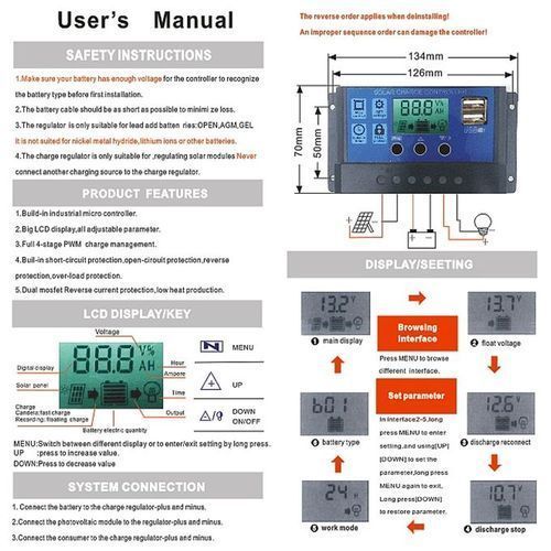 3. The regulator is only suitable for lead-acid batteries: OPEN, AGM, GEL It is not suitable for nickel metal hydride batteries, lithium ions or batteries.