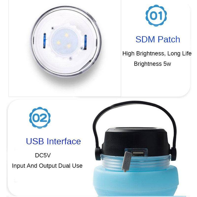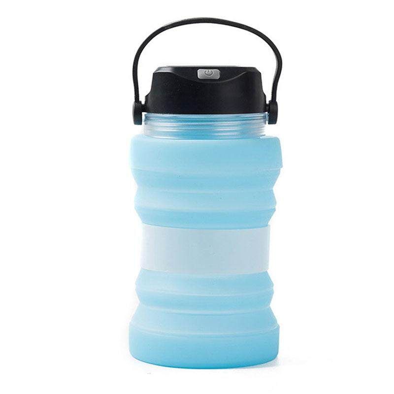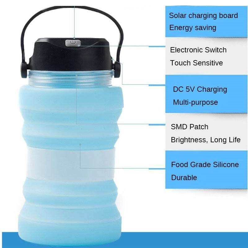 Solar Charging Kettle Outdoor Camping Water Lamp With Lamp Cup Collapsible Kettle Description: 1. Outdoor Solar Water Cup, Which Can Be Filled With Water Or Illuminated, Is An Outdoor Helper. 2. Can Be Folded To Save Space. 3. Food Grade Silicone Material, Health And Safety, High Flexibility, Not Easy To Deform 3. Can Store Small Items And Be Waterproof. 4. Can Be Charged By Mobile Phone, Solar Charging, Energy Saving And Environmental Protection 5. There Are 5 Lighting Modes, 6 Sound Effects Product Specifications: Capacity: 730ml Material: Silica Abs Size: 9*18cm Switch: Electronic Switch Weight: 227g Gear Position: 5 Steps Adjustable Package : 1x Solar Water Cup